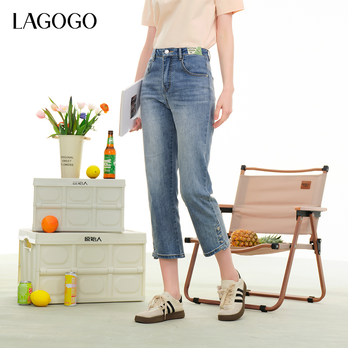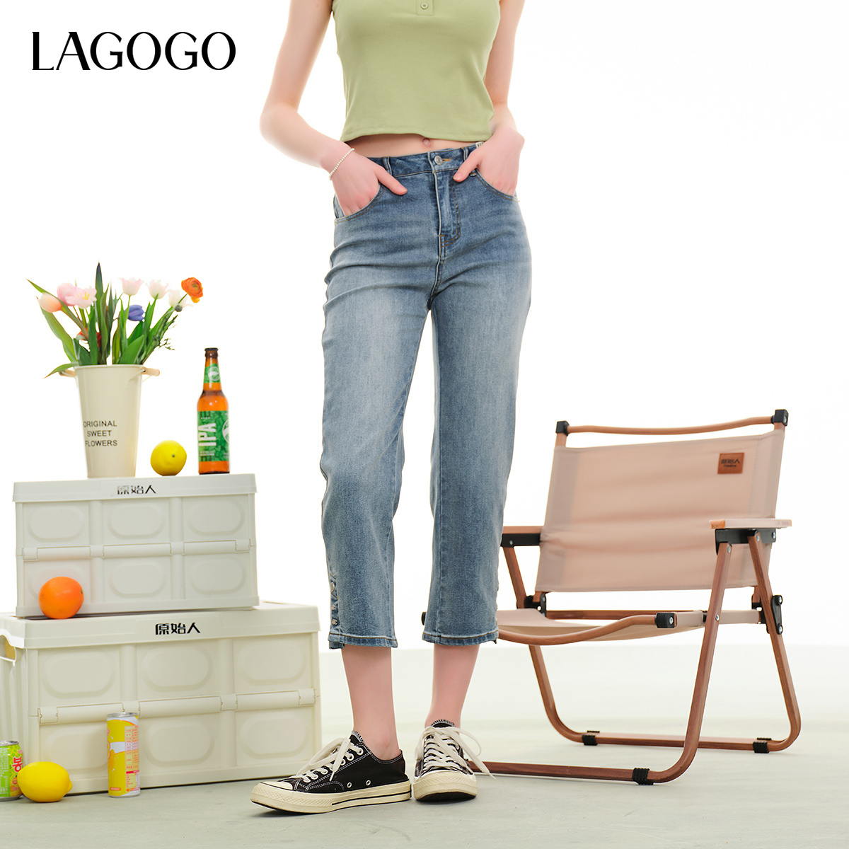 通勤九分直筒裤 新款 女拉谷谷夏季 LAGOGO水洗浅蓝色脚口开叉牛仔裤