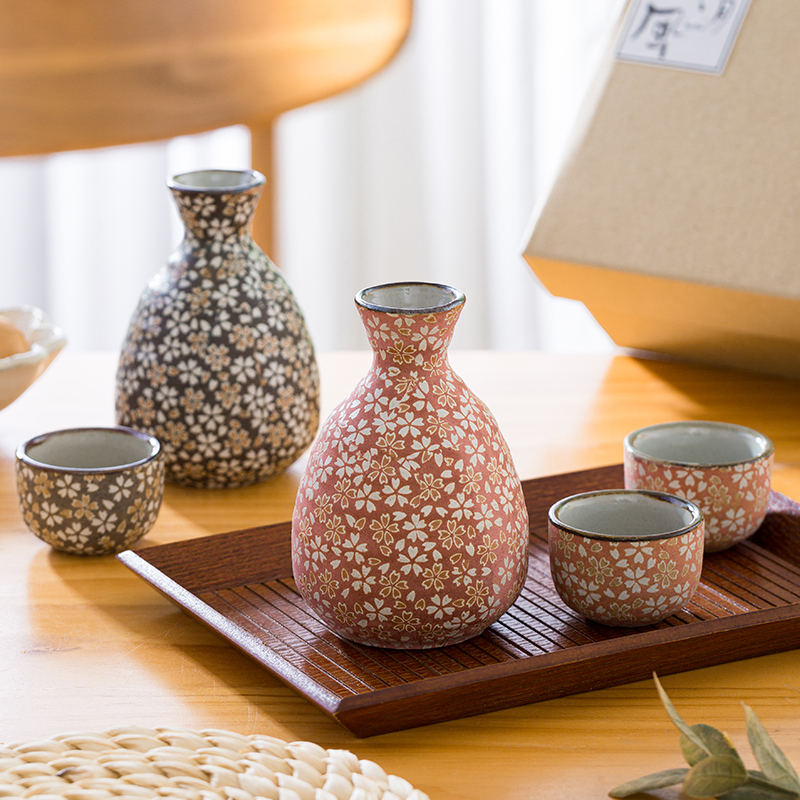 陶瓷烧酒杯 家用老式 日本清酒杯酒具礼盒日式 手绘樱花一壶两杯套装
