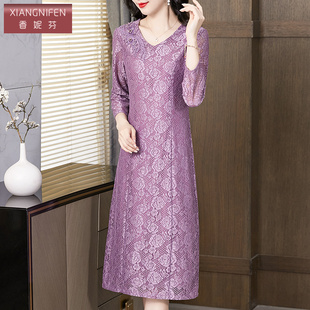 a字裙 温柔风褶皱掐腰漂亮法式 拼接蕾丝紫色斜肩长袖 连衣裙女秋季