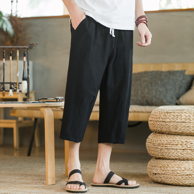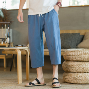 运动过膝八分休闲裤 宽松日系简约直筒亚麻薄款 子男夏季 棉麻七分裤