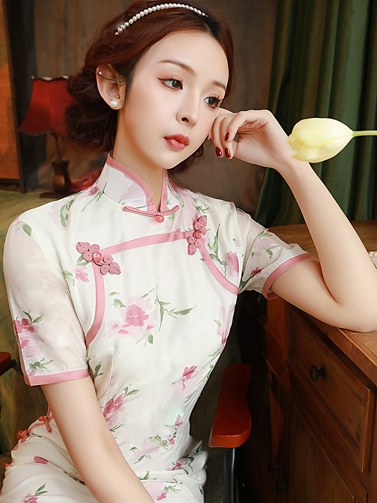 栀花清梦 杏色立领盘扣旗袍连衣裙开衫 早秋季 新中式 女 新款 乔拉