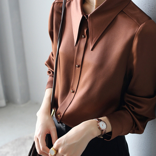 洋气高级感OL通勤休闲简约光泽衬衣潮 女时尚 黑色醋酸缎面长袖 衬衫