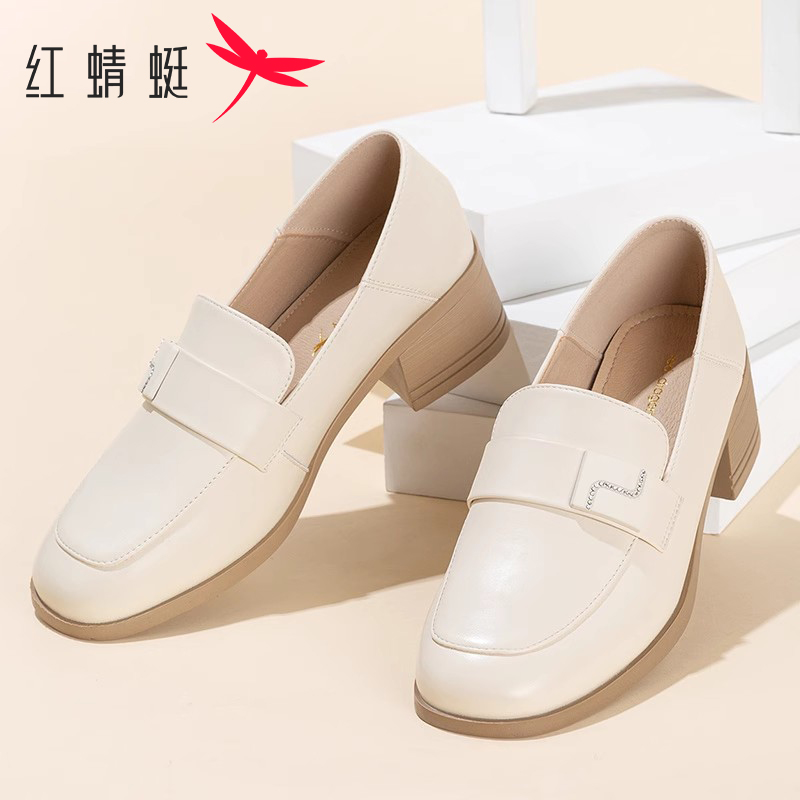 女软皮粗跟女士皮鞋 红蜻蜓女鞋 真皮方头浅口中跟单鞋 新款 2025春季