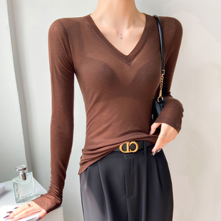 t恤薄款 天丝羊毛打底衫 轻奢高级感透视上衣v领长袖 2025新款 女秋季