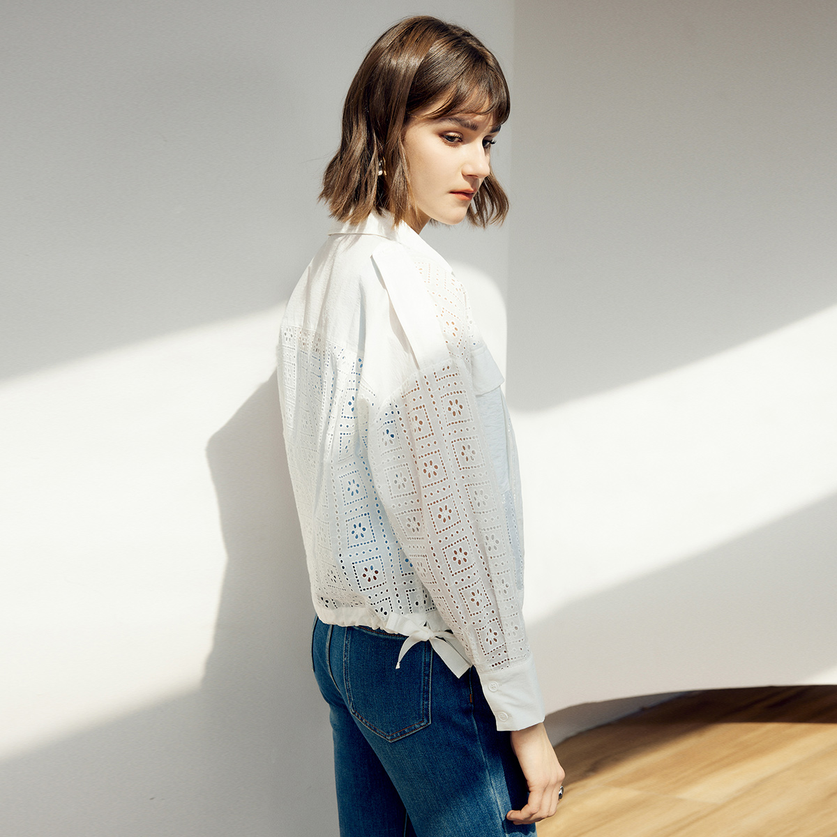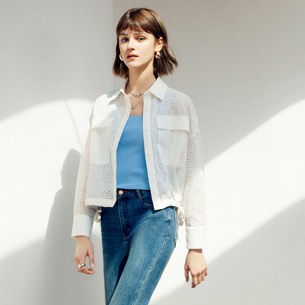通勤简约纯棉上衣 早春时尚 颜域白色镂空翻领短款 外套女士2025新款