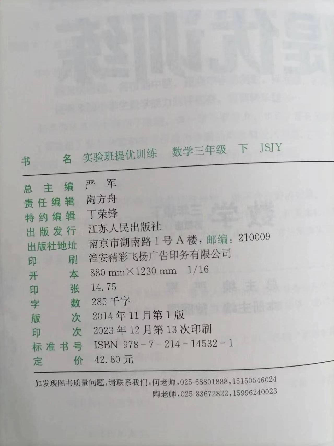 包邮 3年级下册 2024春 练习类 小学教辅练习册同步教材基础提优训练三年级同步训练 实验班提优训练三年级下册数学JSJY苏教版