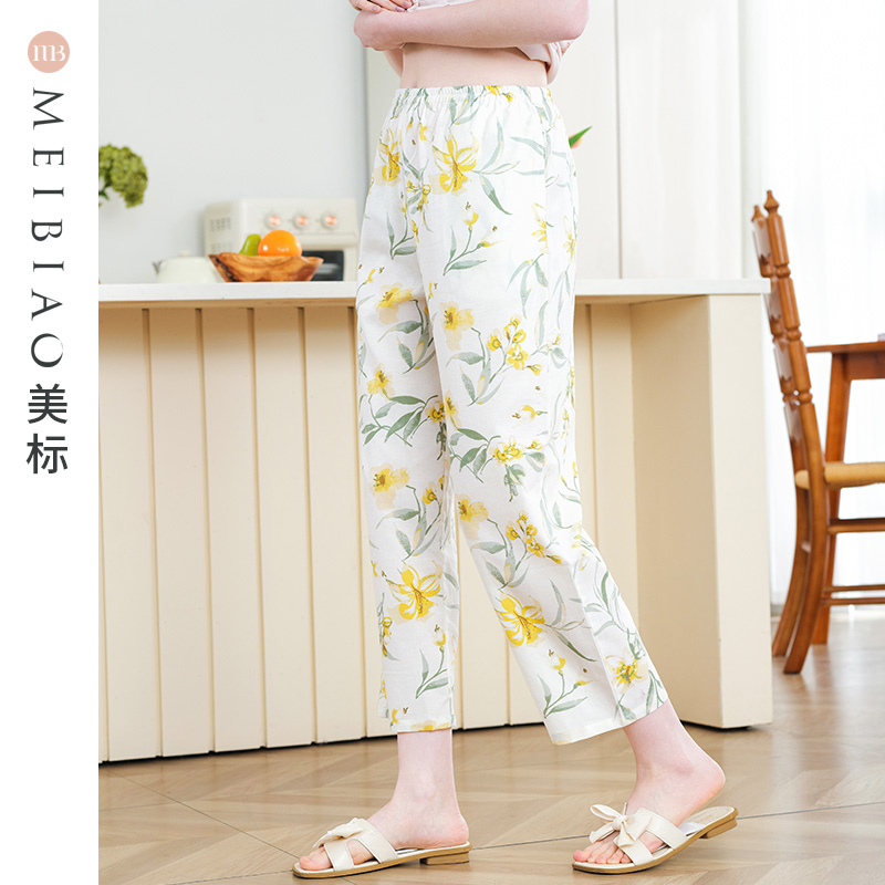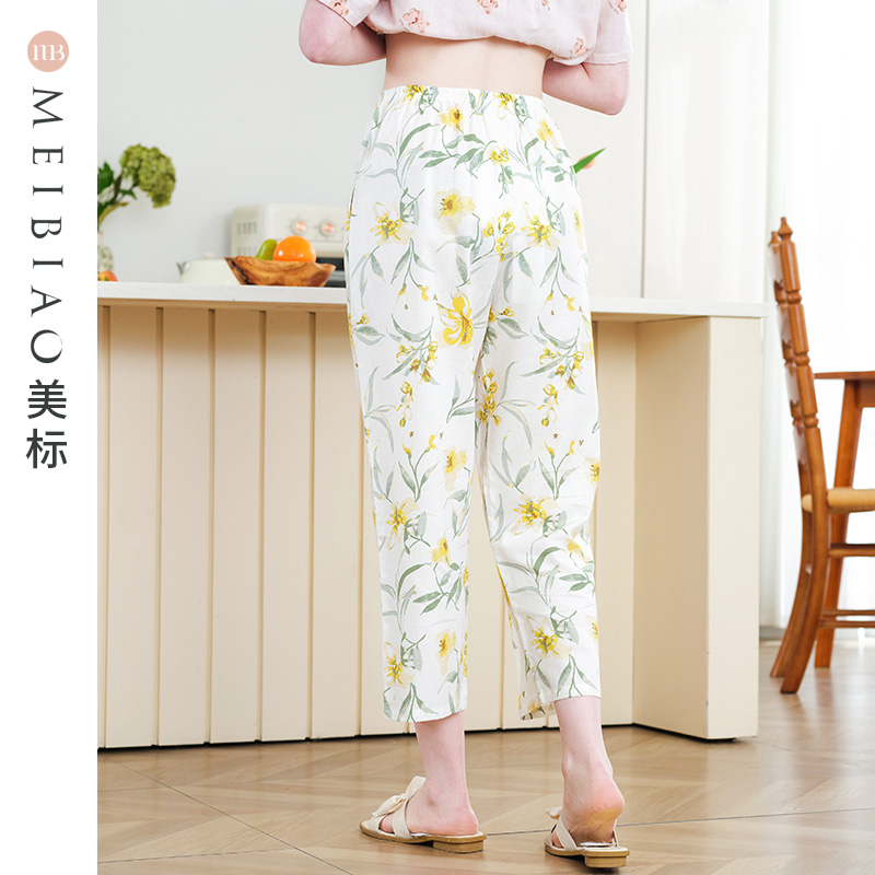 单裤 美标新款 宽松可外穿亚麻九分裤 女春夏棉质清新印花居家裤 睡裤
