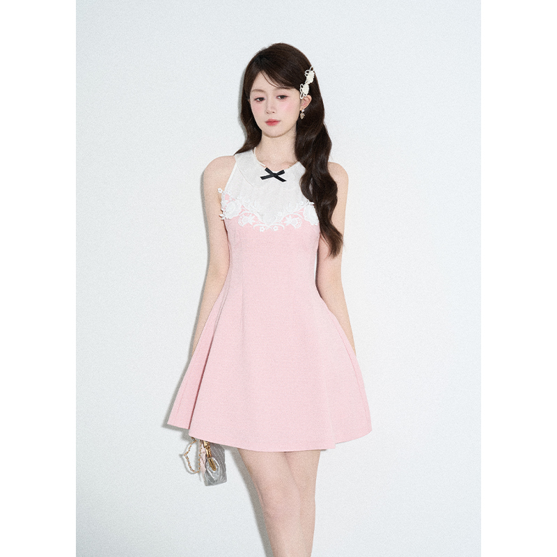 娃娃领拼接蕾丝粉色挂脖连衣裙女夏季 小香风收腰甜美a字短裙 法式