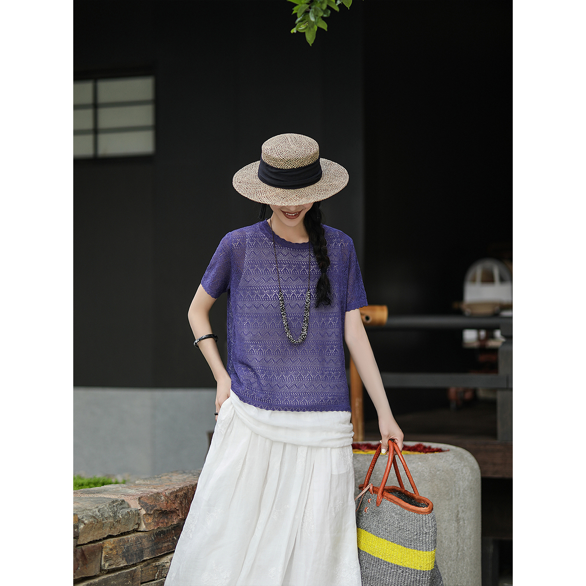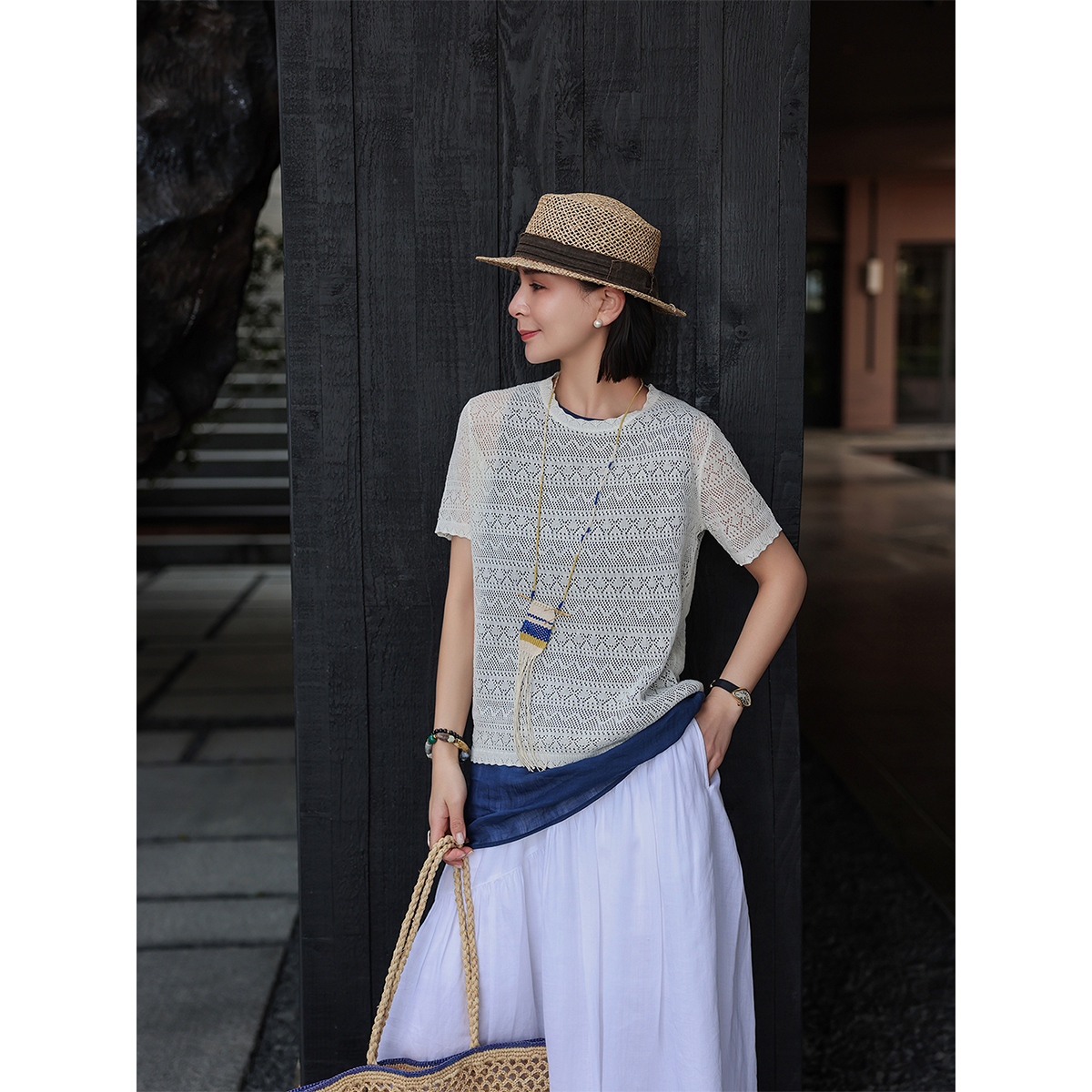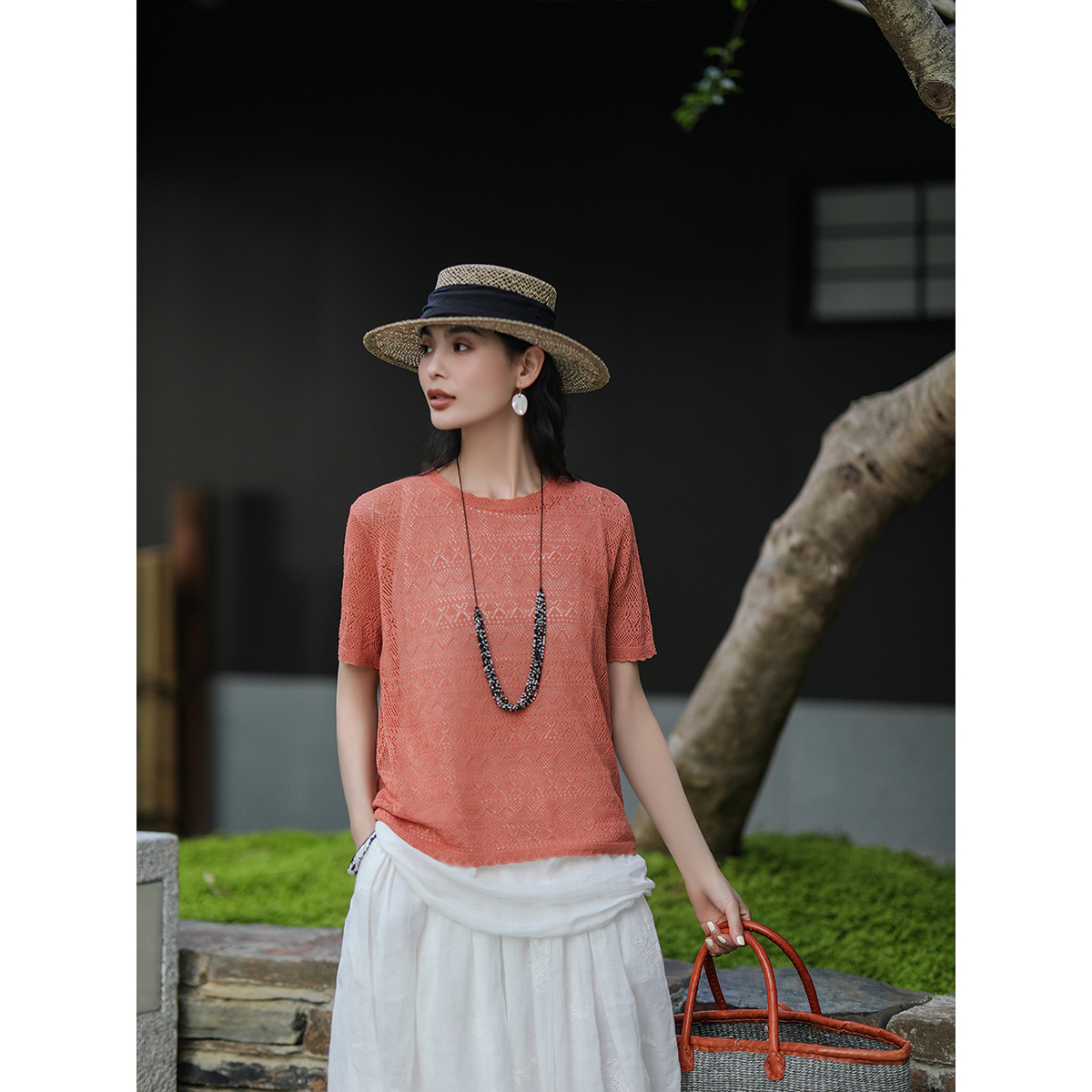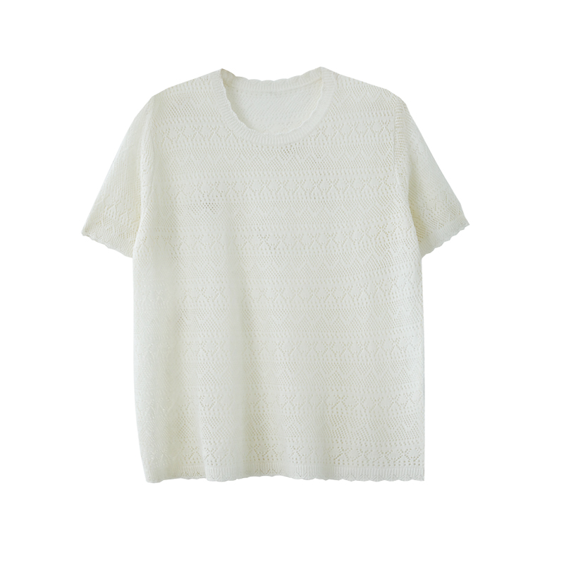 无尽夏 麻霖夏新品 亚麻莱赛尔镂空提花肌理感文艺休闲针织上衣