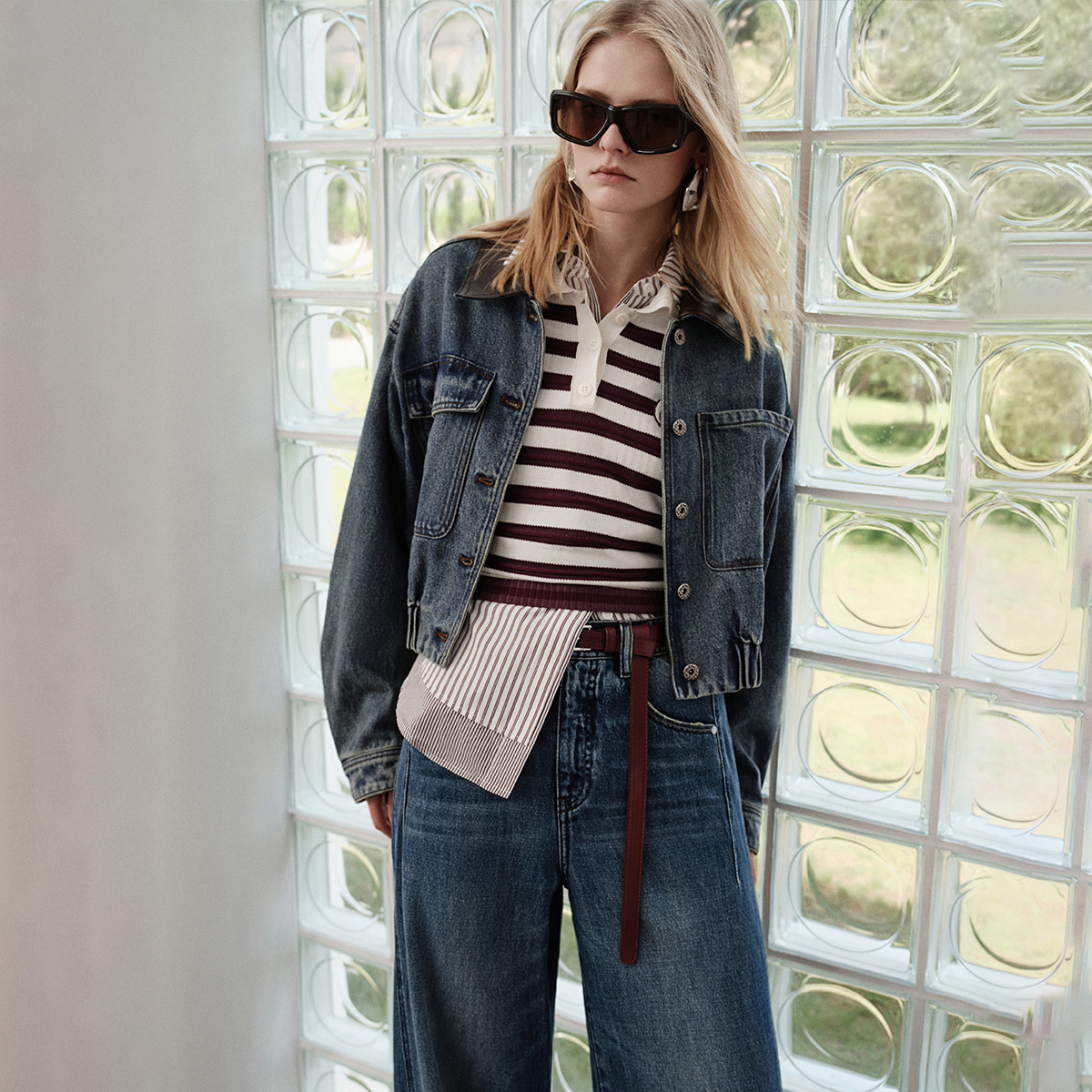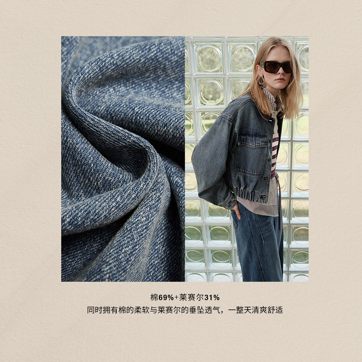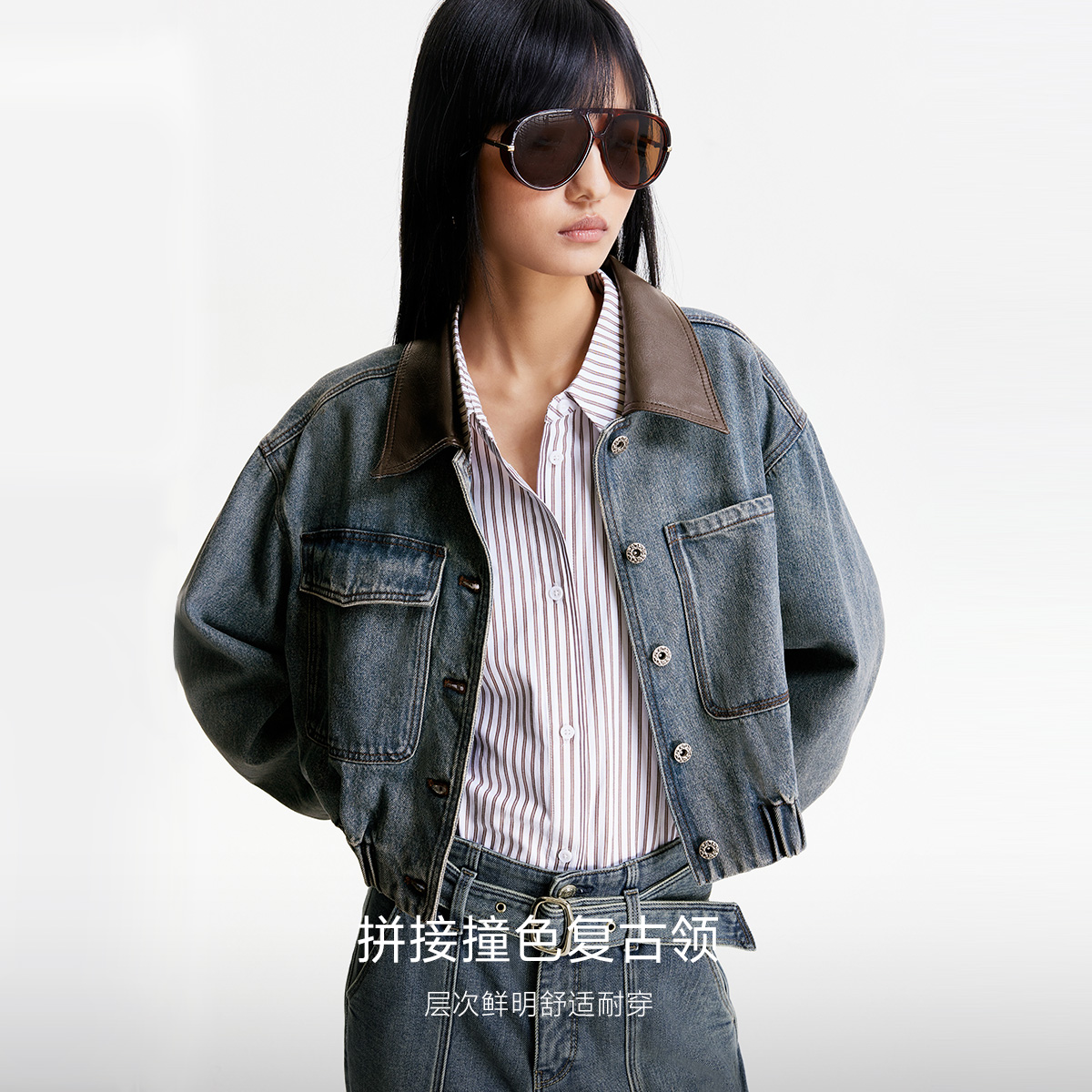 饰口袋落肩牛仔外套女 酷飒拼接翻领不对称装 ONLY2025秋季 新款