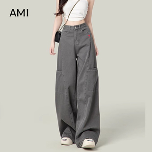 复古高腰宽松直筒牛仔裤 AMI美式 女2025新款 裤 子潮 水泥灰阔腿工装