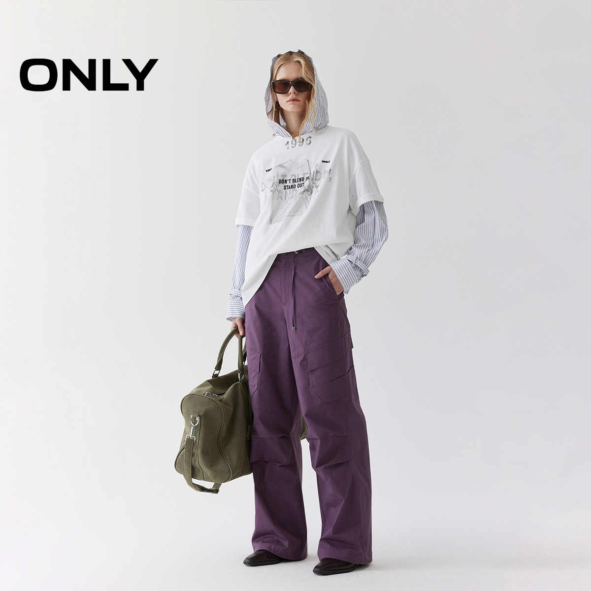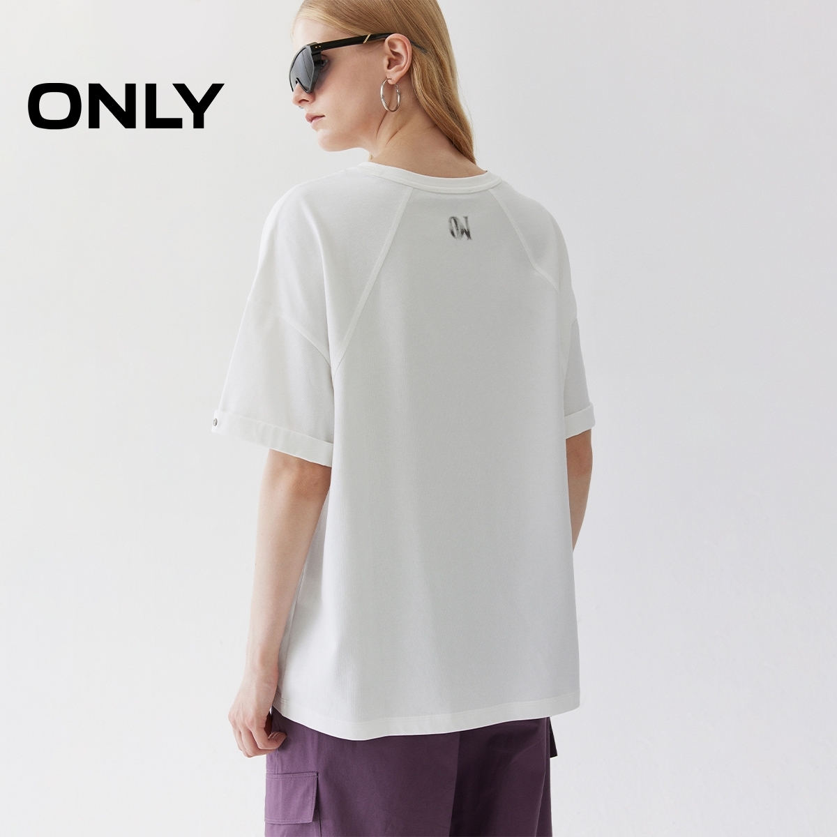 口圆领宽松落肩短袖 酷感破碎胶印翻边袖 T恤女 新款 ONLY2025秋季