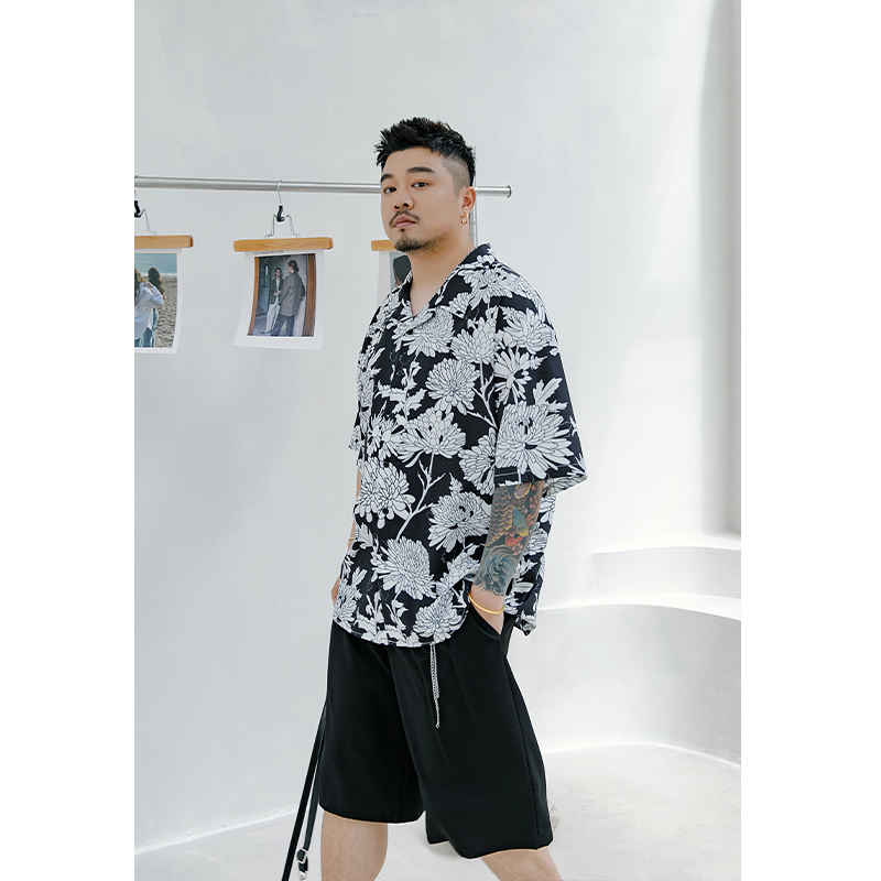 中性日系衬衫 男加肥加大复古黑白短袖 胖潮7689 花衬衫 原创大码