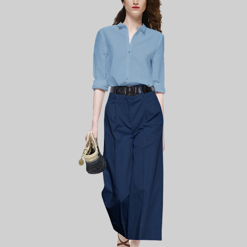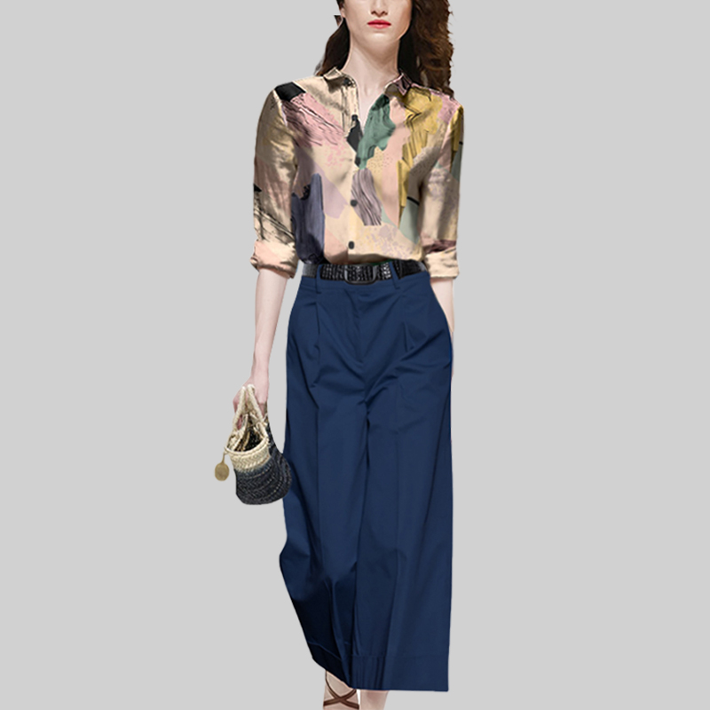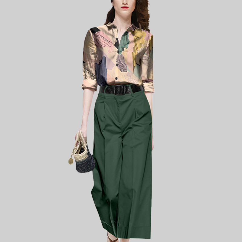 修身 2025年新款 绿色阔腿裤 女复古衬衫 两件套 秋高级感气质印花套装