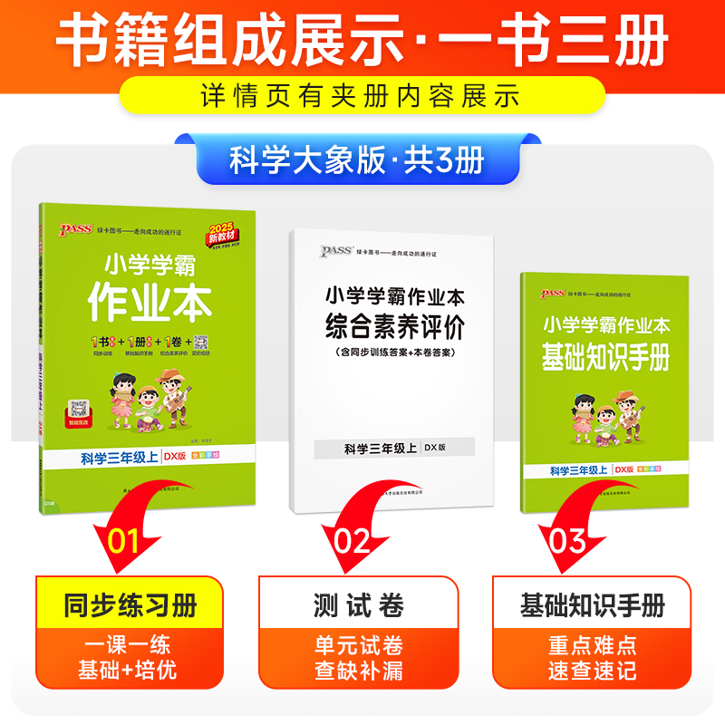 25秋 科学小学学霸作业本三年级课本同步练习册知识点提优训练上下册练习题科学试卷达标测试实验视频天天练PASS绿卡图书 大象版