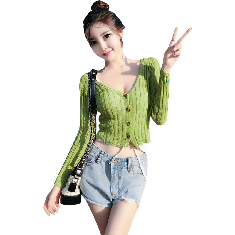 V领夏季 长袖 修身 性感露脐短款 女 薄款 防晒上衣针织开衫 辣妹打底衫