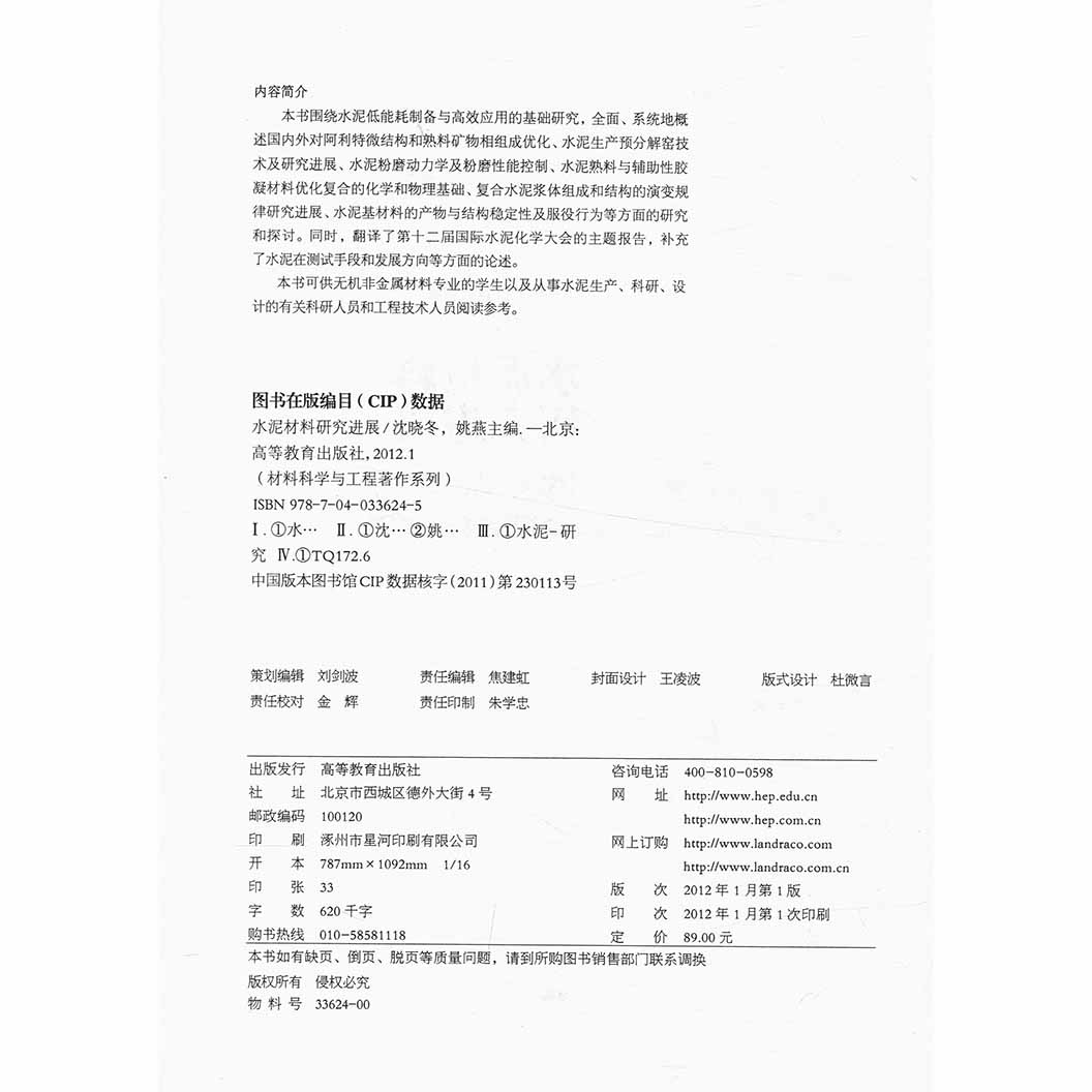 社 高等教育出版 材料科学与工程著作系列供从事水泥生产科研设计相关科研技术人员参考 沈晓冬姚燕 水泥材料研究进展