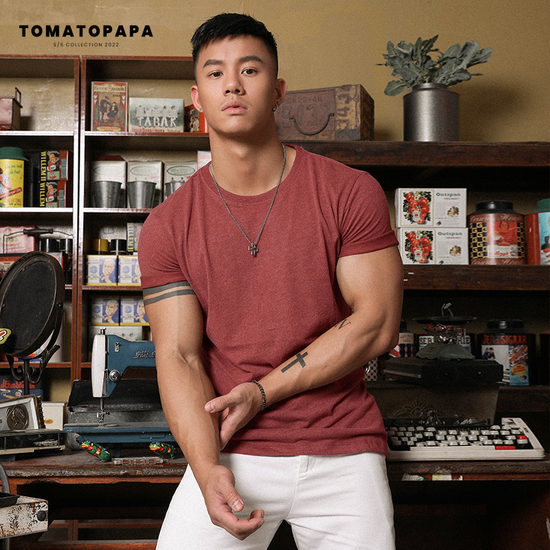 型男健身 TOMATOPAPA欧美运动风花纱混纺T恤男休闲纯色短袖 2件