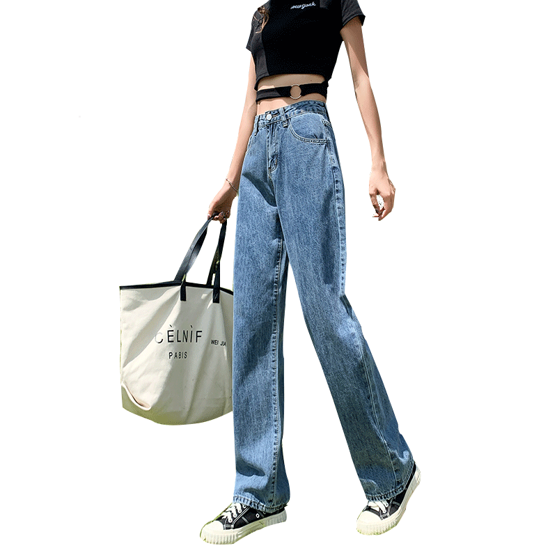高腰显瘦阔腿直筒长裤 小熊刺绣蝴蝶结浅蓝色牛仔裤 女春秋2025新款