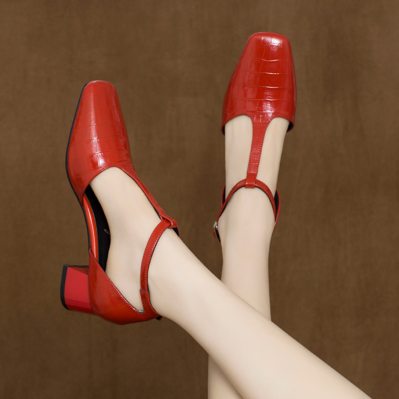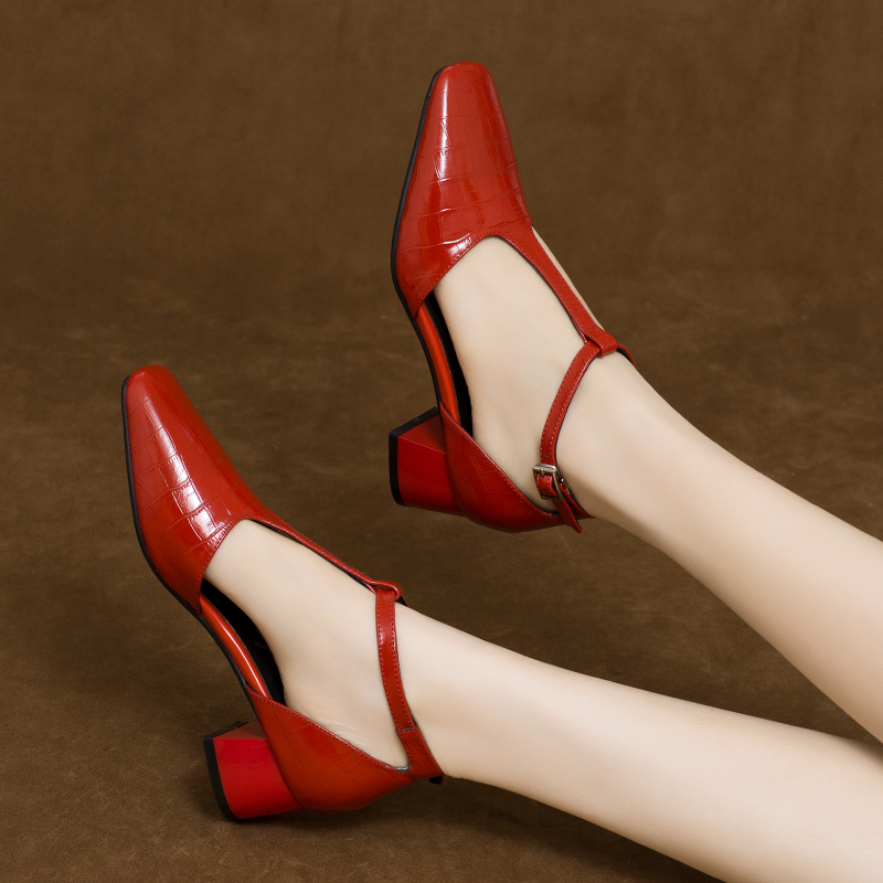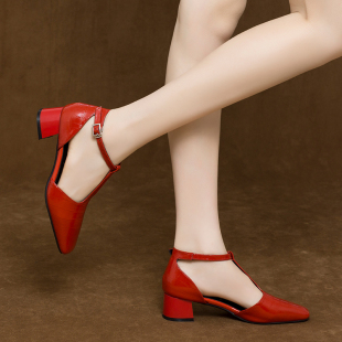 方头粗跟包头凉鞋 女鞋 时尚 红色单鞋 子 2025年新款 中跟真皮鞋 春夏季