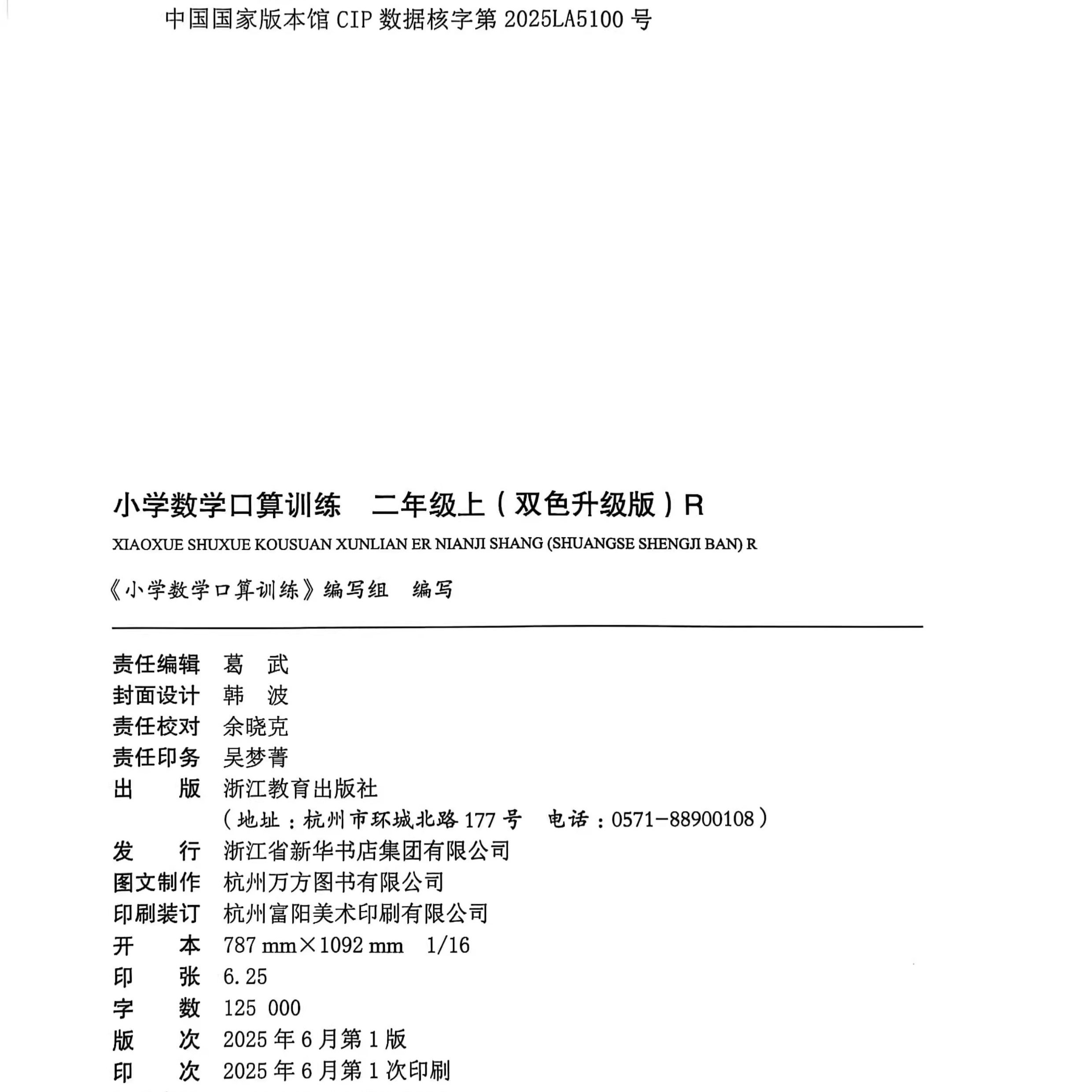 义务教育教材小学数学口算训练二年级上册课本配套人教版 2025秋双色版 口算心算天天练计算题作业本速算2年级上计算卡 学校同款