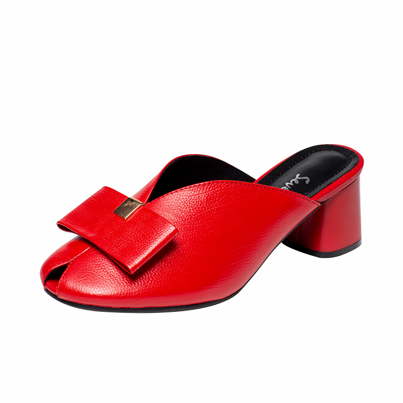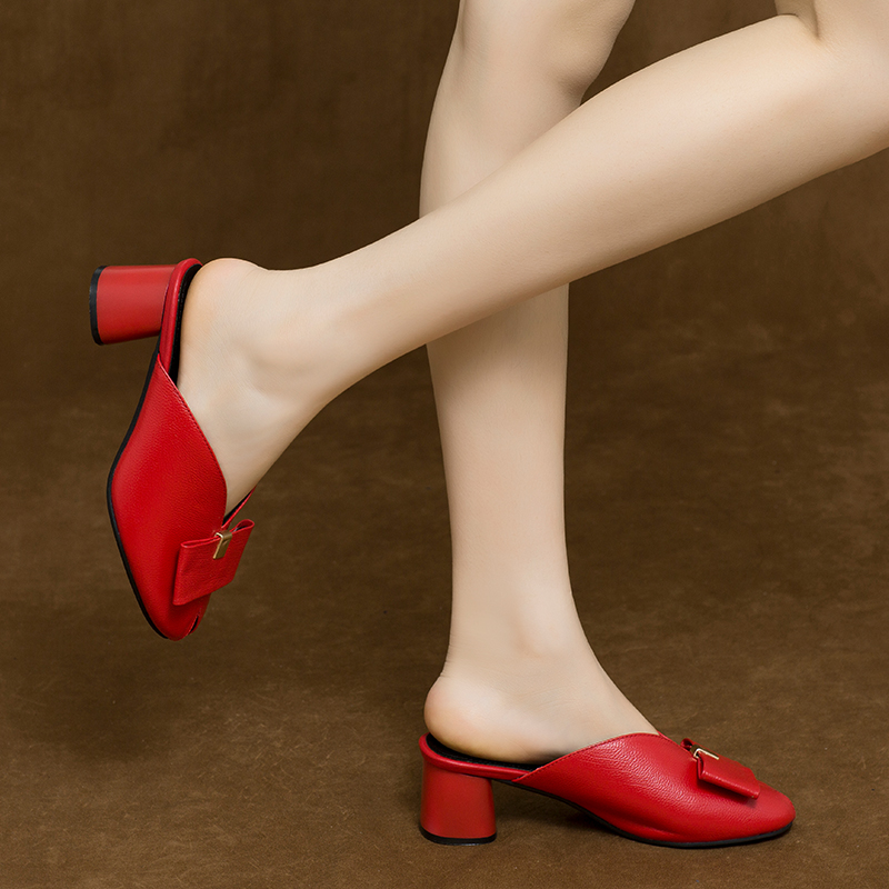 女外穿红色中跟妈妈真皮凉拖鞋 鱼嘴粗跟包头半拖鞋 夏季 2025年新款