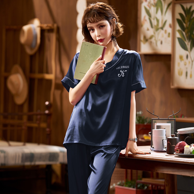 薄款 两件套装 冰丝短袖 夏天家居服女仿真丝绸加大码 长裤 睡衣女夏季