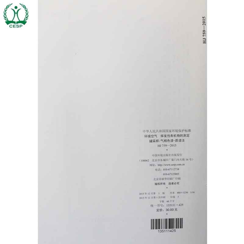 测定 环境保护 罐采样 挥发性有机物 2015 中国环境出版 气相色谱法 社 国家标准 环境空气 国标 759 正版 135111425 质谱法