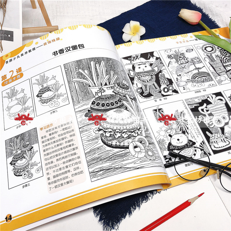 儿童线描入门教程画室培训教材黑白画线性速写线描人物动物植物画教程创意美术线描场景装 青藤少儿美术教程 正版 饰线描 饰画教程 装