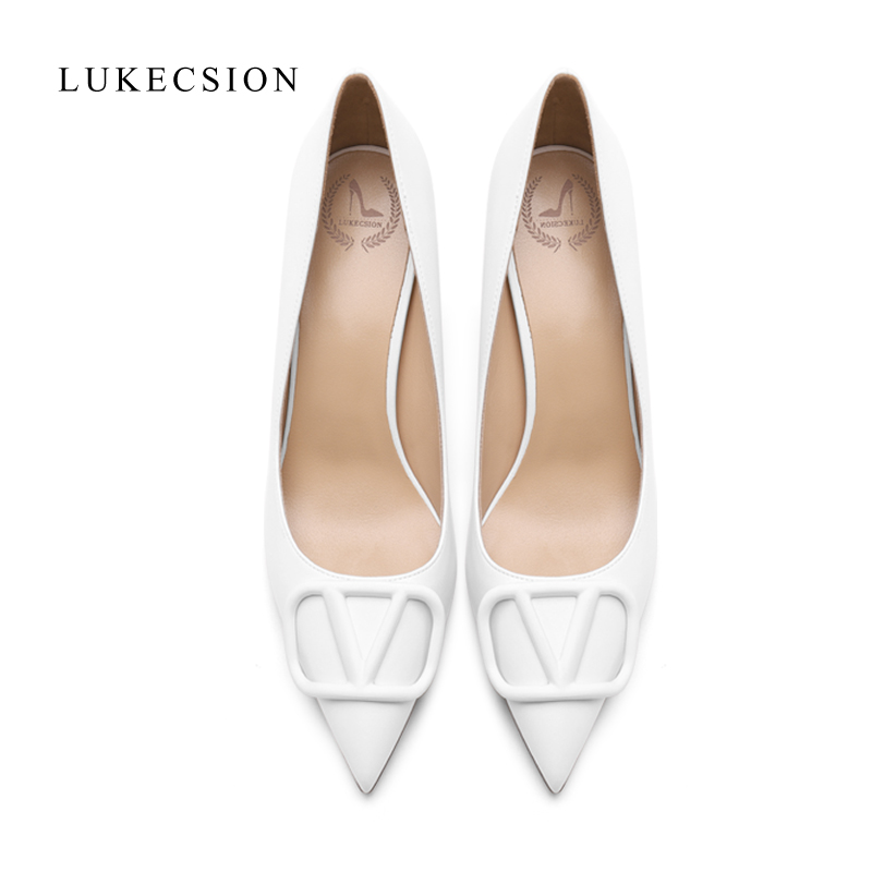 LUKECSION漆皮V字高跟鞋 女真皮白色简约气质名媛尖头细跟8cm单鞋