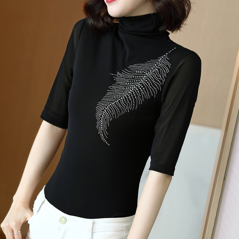 薄款 女韩版 t恤半袖 夏季 上衣 秋装 蕾丝网纱中袖 外穿黑色高领打底衫