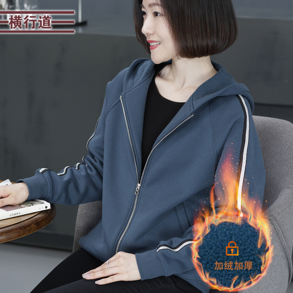 加厚加绒妈妈连帽外套女大码 宽松长袖 带帽拉链口袋插肩袖 胖MM冬装