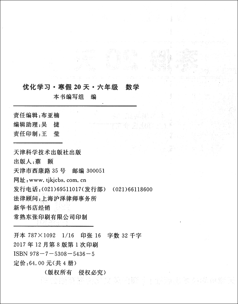 快乐寒假学程 寒假每天一练 六年级数学 第8版 中小学寒假作业 上海地区专用 优化学习寒假20天 6年级 沪教版 正版 教材教辅 现货
