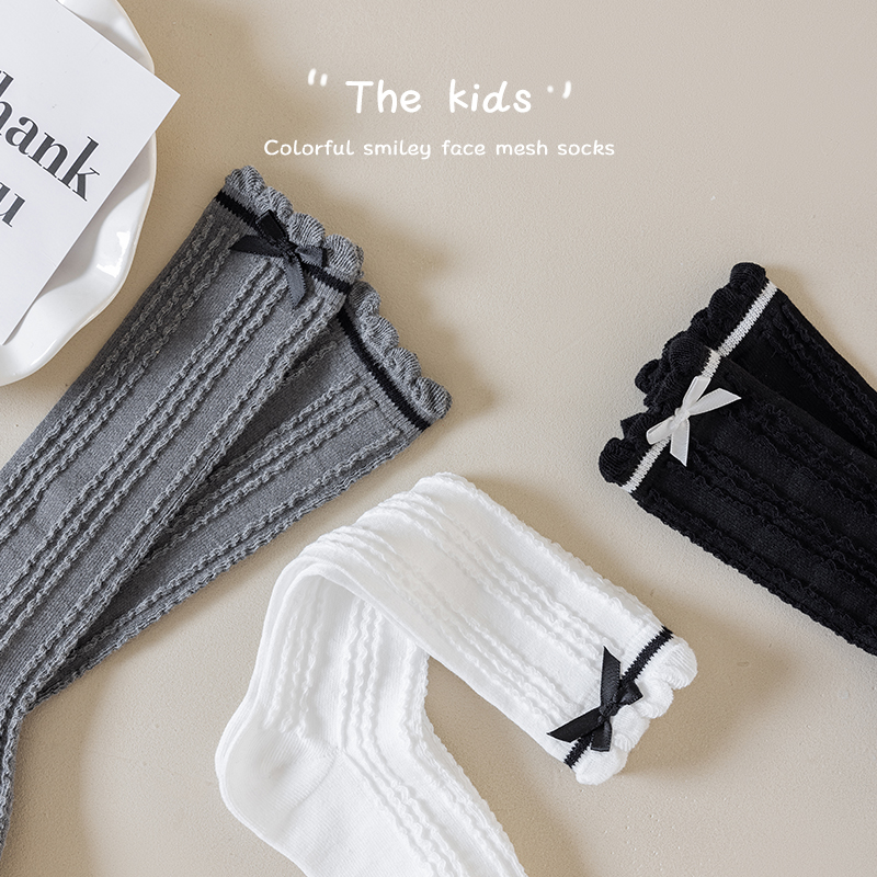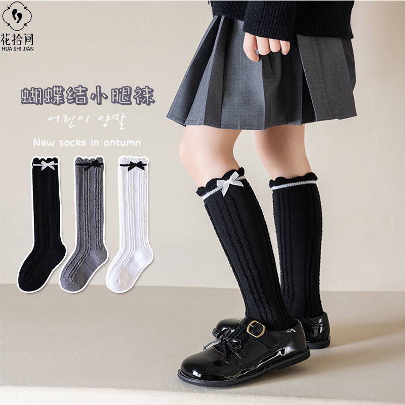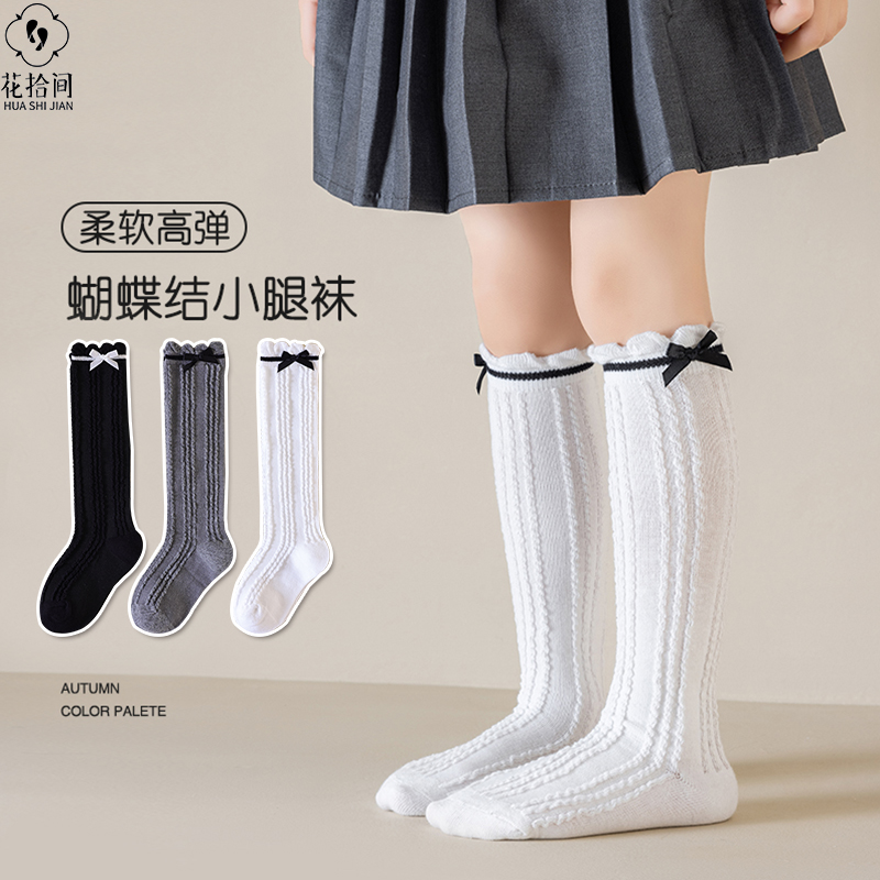 女童长筒袜纯棉春秋白色花边小腿袜蝴蝶结女孩中筒袜洛丽塔公主袜