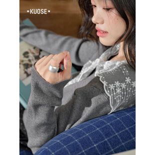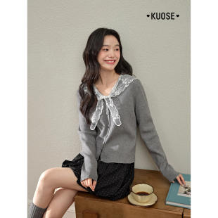 长袖 新款 毛衣外套 上衣女2025秋季 阔色蓝色慵懒海军领镂空针织开衫