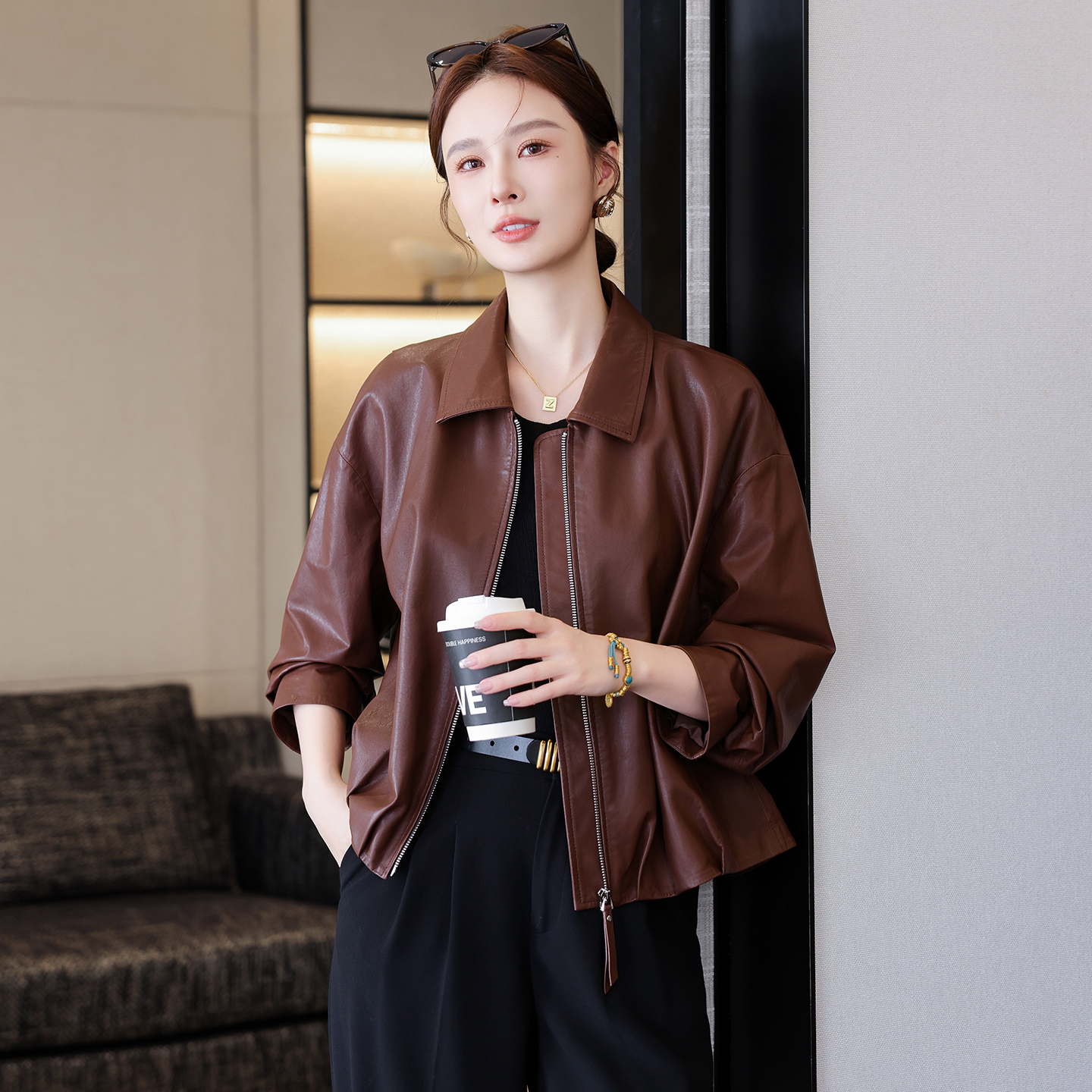 收腰翻领上衣 棕色皮衣外套女流行复古短款 DPLAY2025年秋季 新款