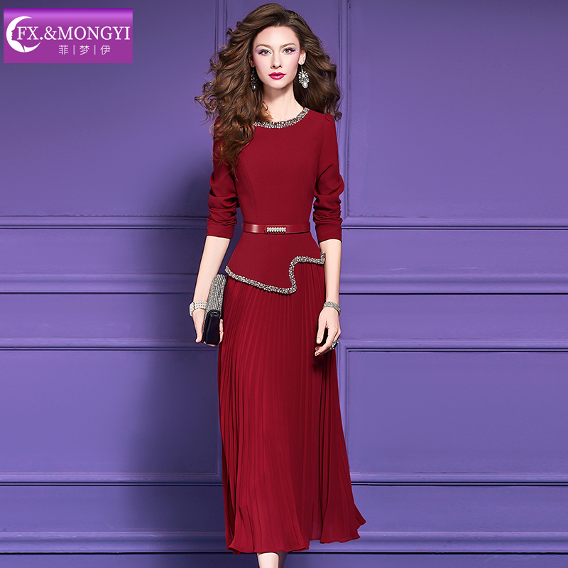 菲梦伊原创钉珠紫色连衣裙女长袖 别致独特绝美收腰百褶长裙子 秋装