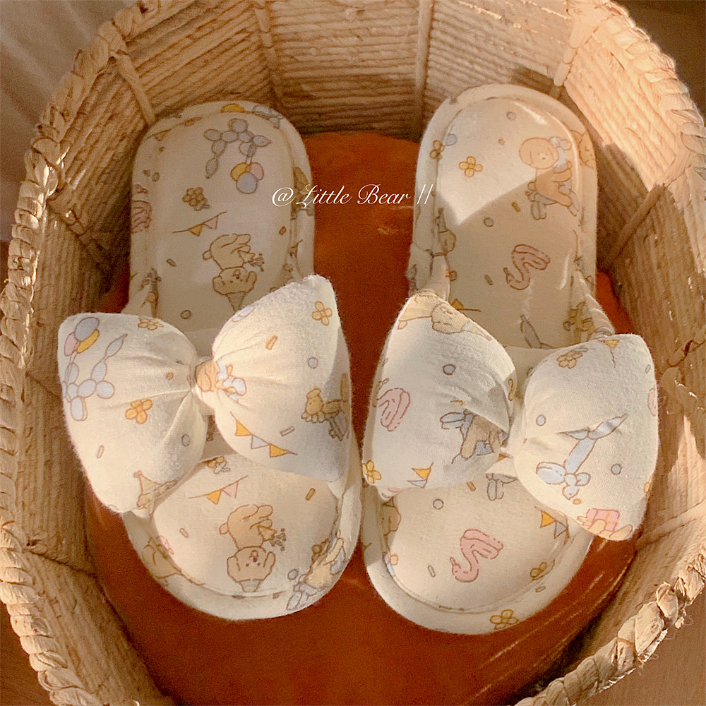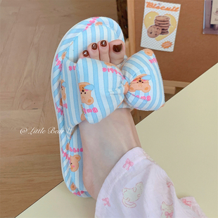 ins 轻便防滑家用地板鞋 细细条甜美卧室棉麻拖鞋 可爱小熊女春夏季