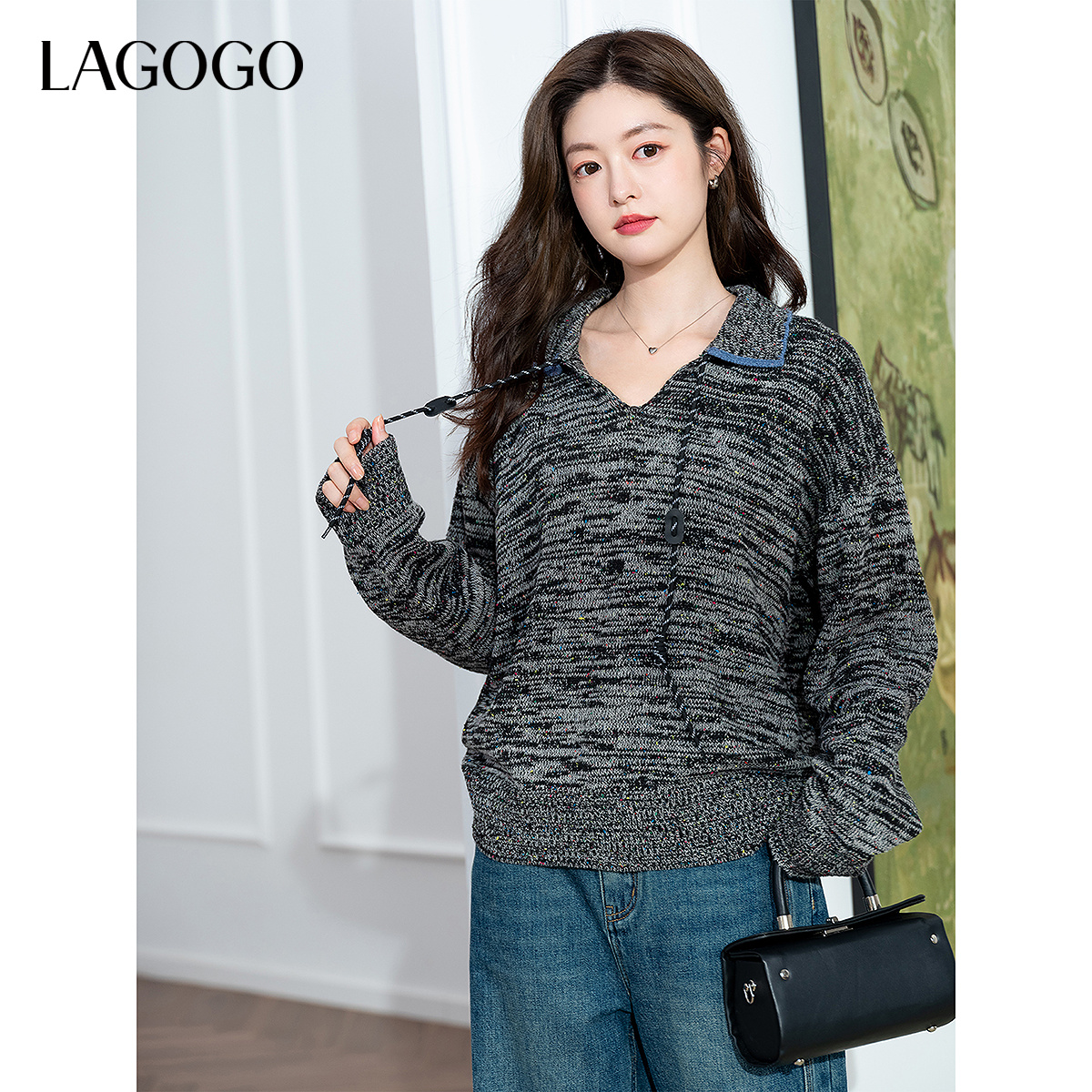 LAGOGOPOLO领抽绳针织衫 深灰色复古宽松上衣 女拉谷谷2025秋冬新款