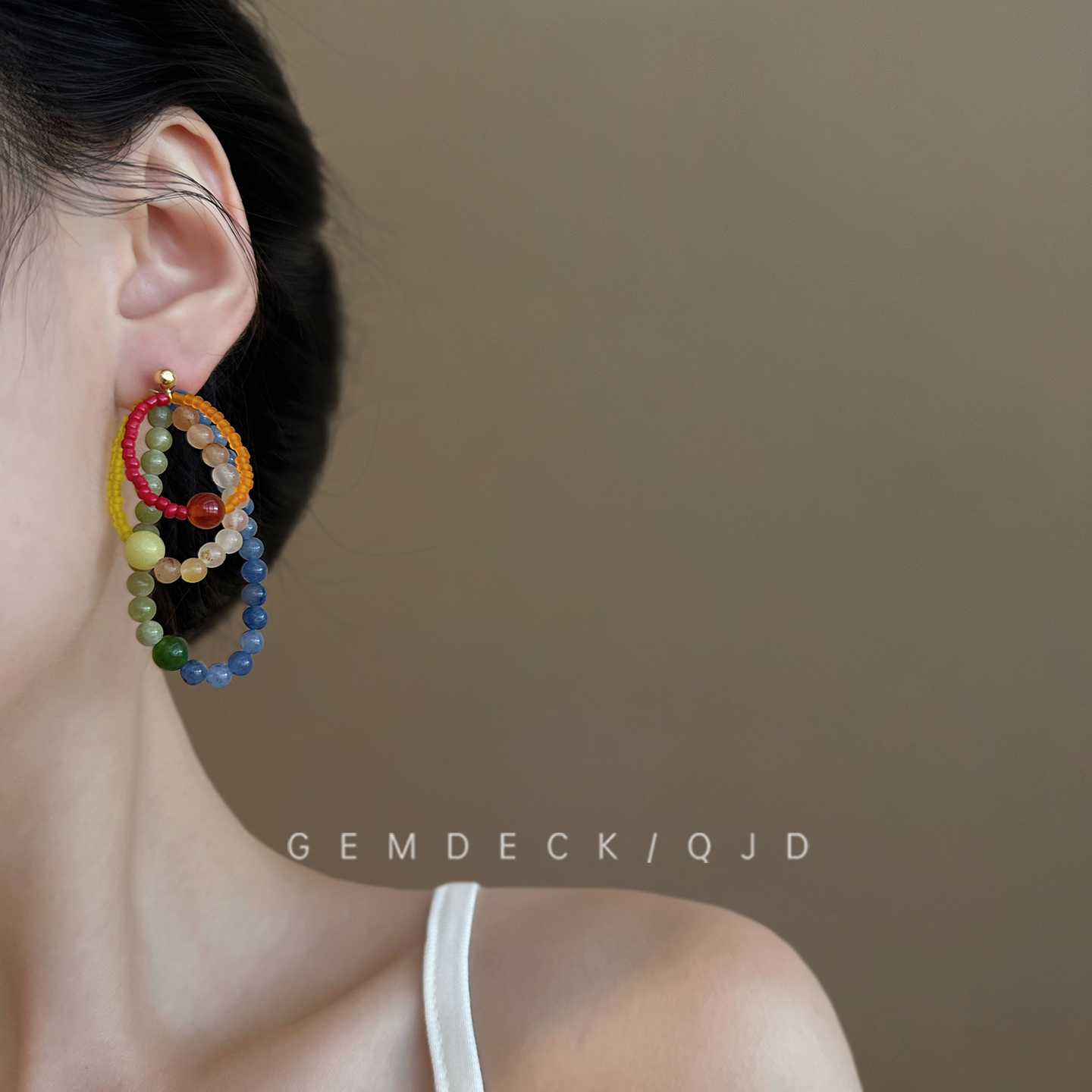 多巴胺彩色水晶串珠耳环气质撞色度假风耳钉2025新款 小众耳夹耳饰