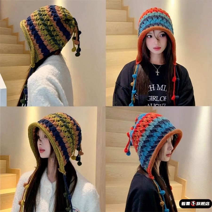 2025撞色毛线帽子女冬季 保暖护耳手工编制包头针织冷帽大头围 新款