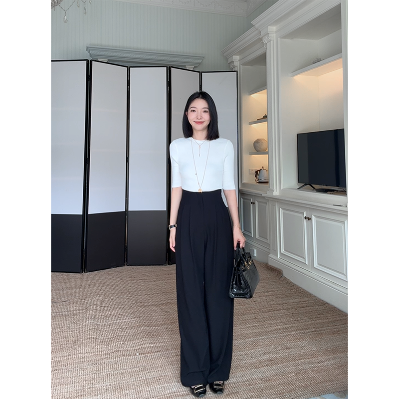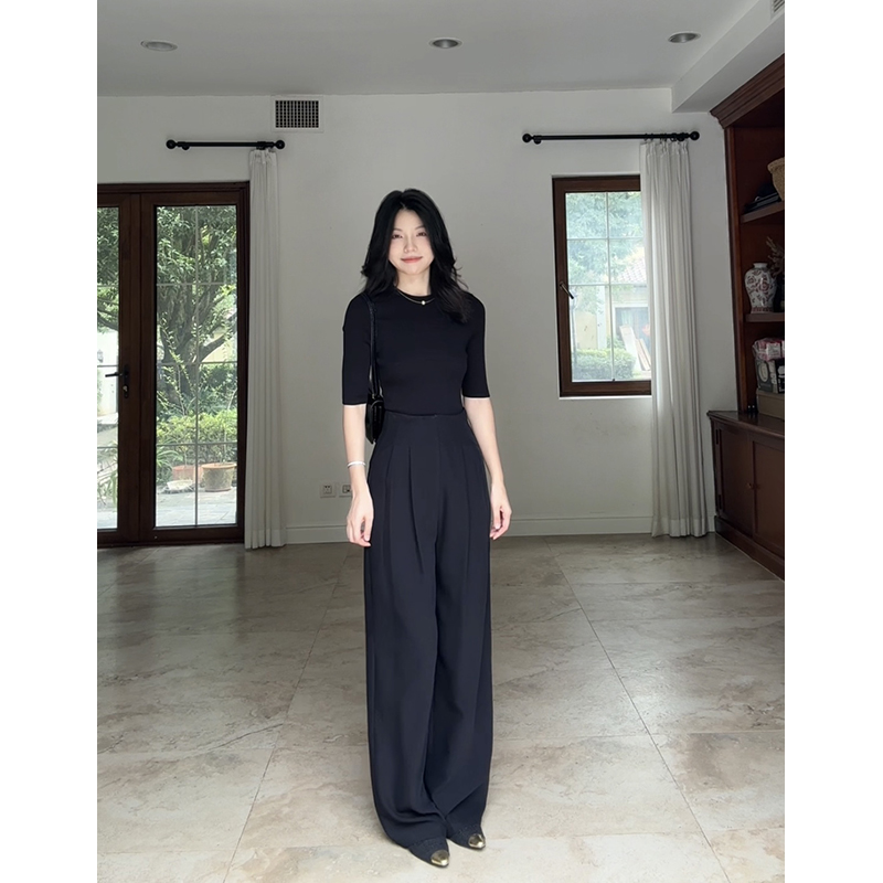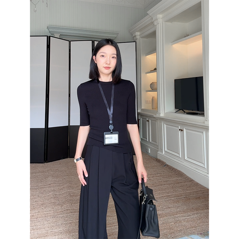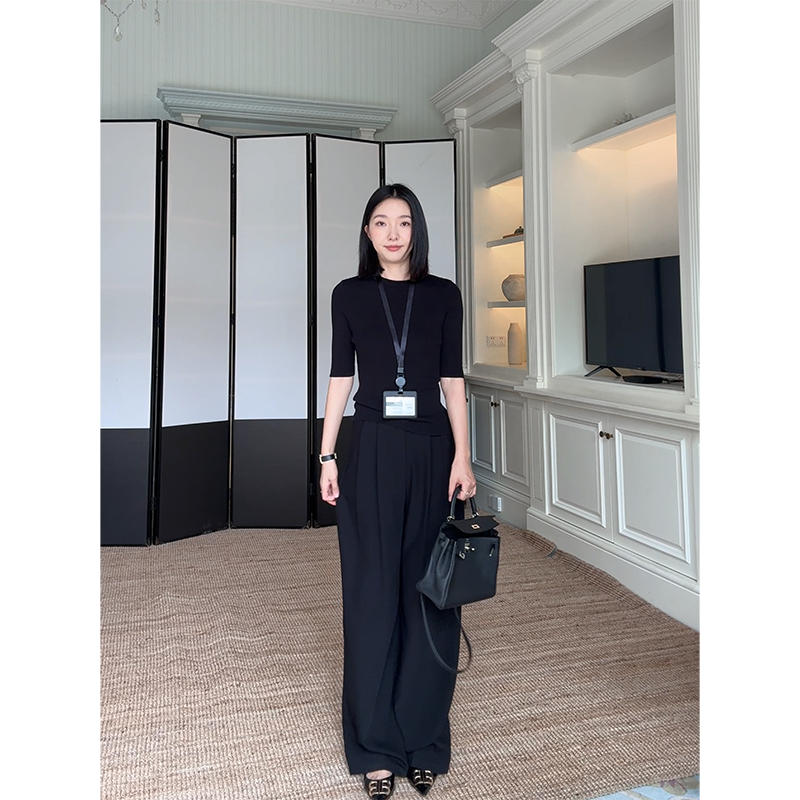 女 早秋上衣高腰直筒阔腿裤 郭九九呢天丝简约修身 显瘦打底针织衫