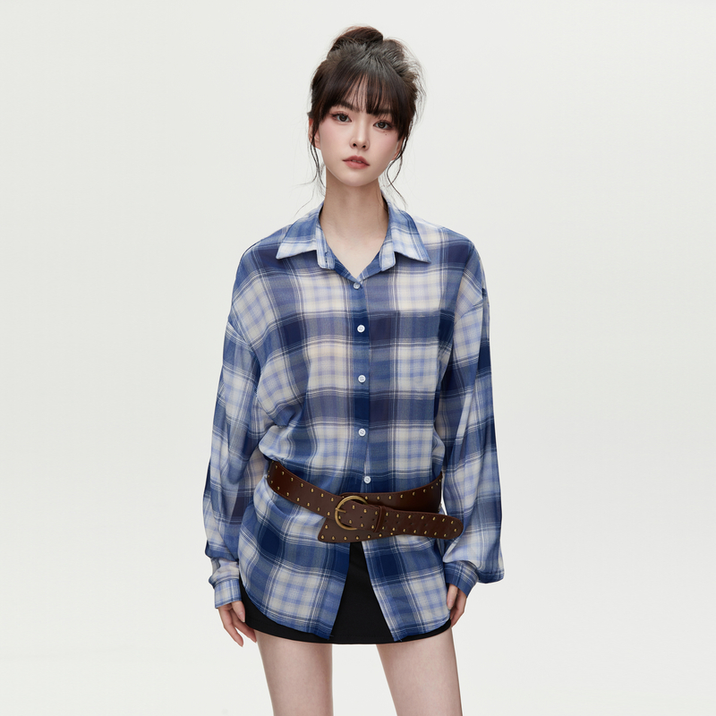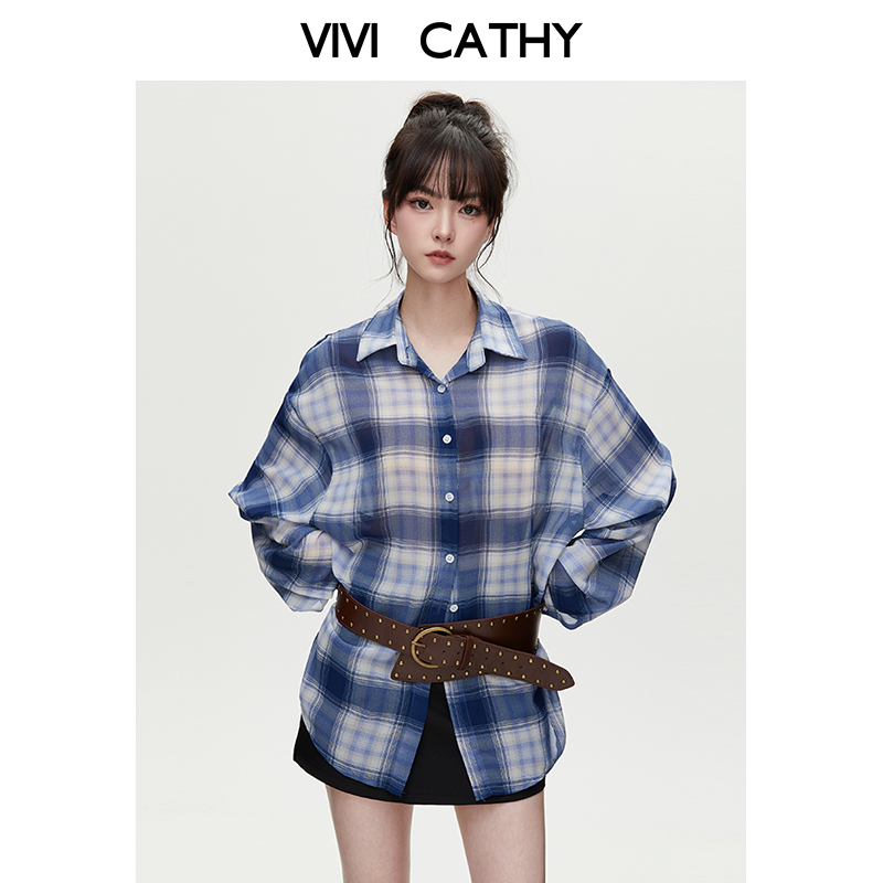 女松弛慵懒感宽松上衣 衬衫 VIVICATHY2025秋美式 复古蓝色格纹长袖
