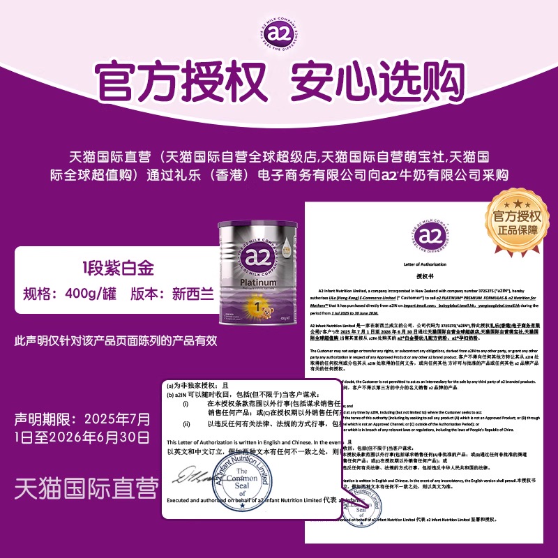 6个月宝宝乳粉400g小罐 a2新升级紫白金1段婴幼儿牛奶粉0 自营