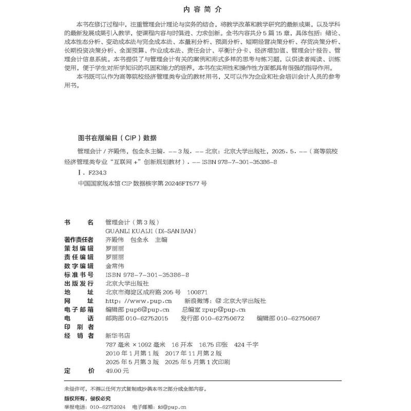 第3版 齐殿伟 北京大学出版 2025新书 社9787301353868 创新规划教材 管理会计 高等院校经济管理类专业互联网 正版 包全永