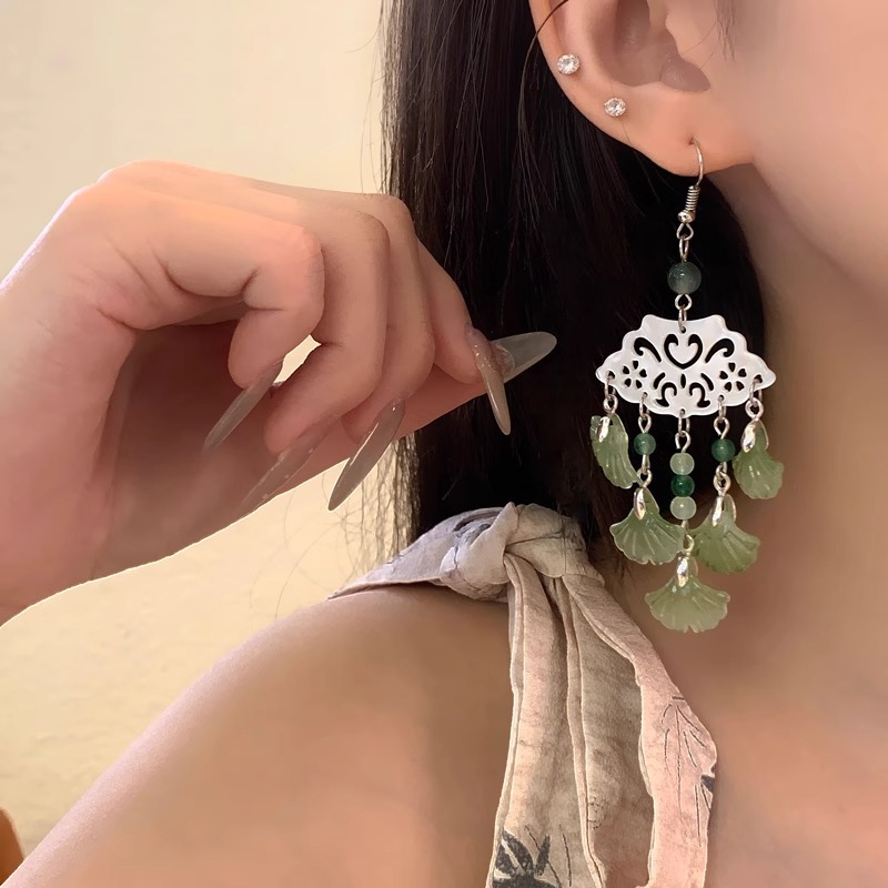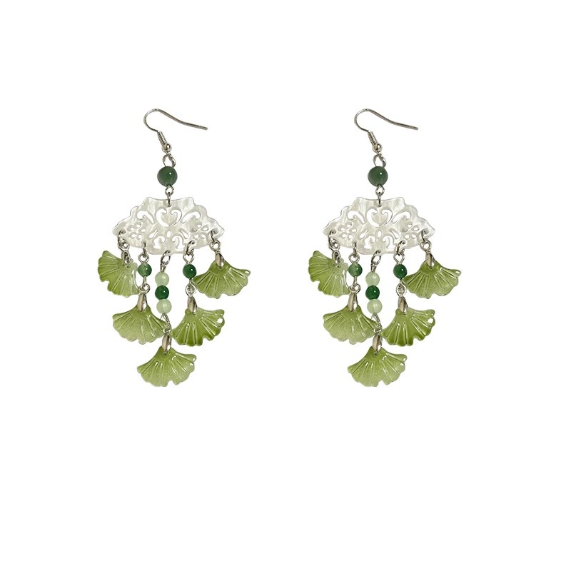 绿银杏叶气质民族风耳饰 时尚 2025新款 古风古典扇形流苏耳环个性