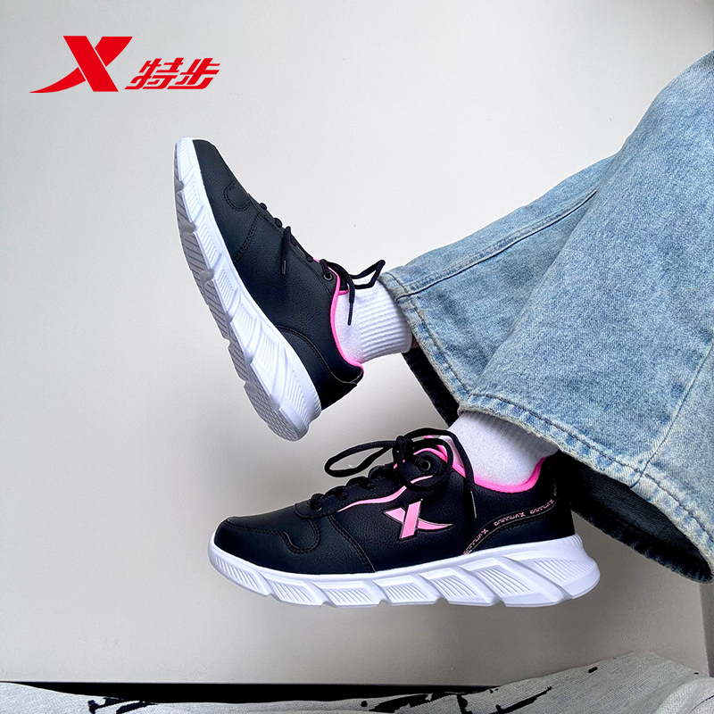 女款 黑色跑鞋 秋季 官方旗舰正品 女 初中生皮面休闲运动鞋 特步跑步鞋