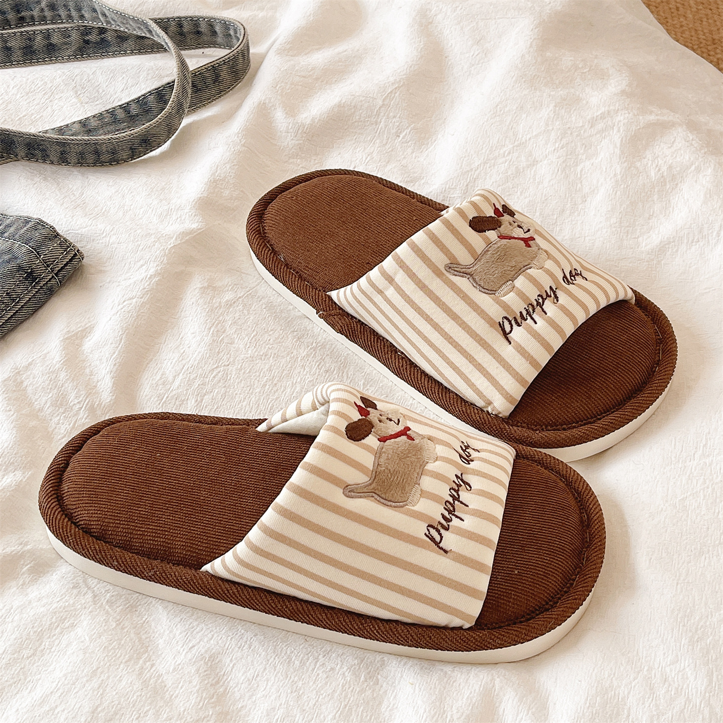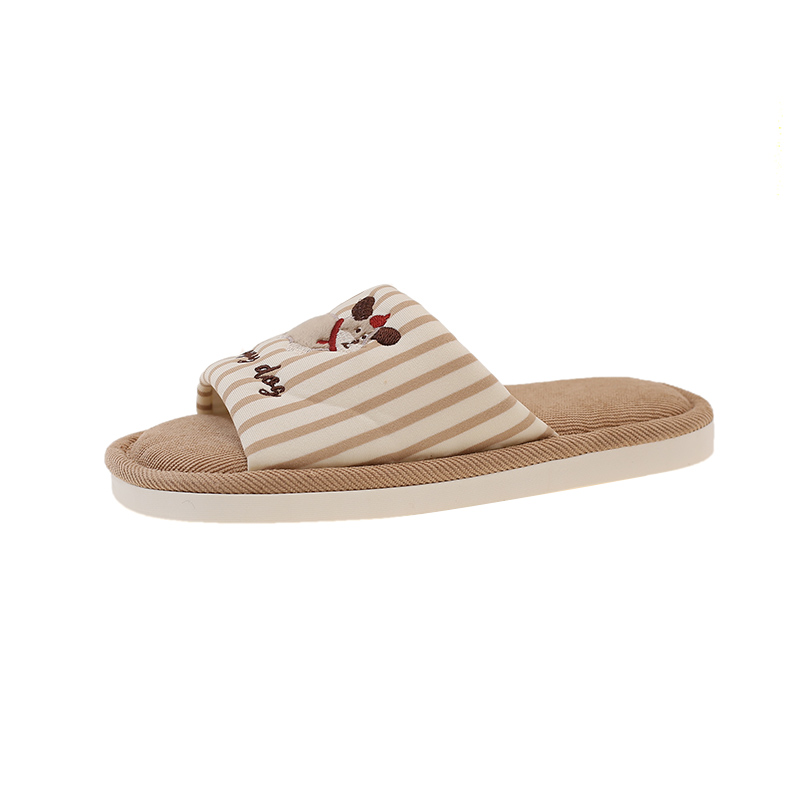 情侣室内居家吸汗软底防滑一字拖男 四季 可爱小狗条纹棉麻拖鞋 女款
