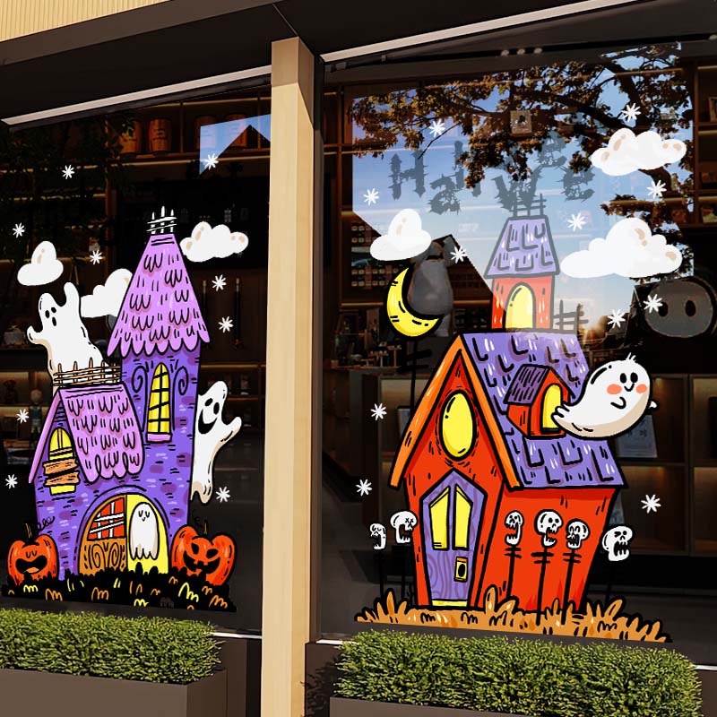 万圣节装 商场窗花店铺 饰玻璃贴纸静电橱窗门贴卡通城堡电影院个性