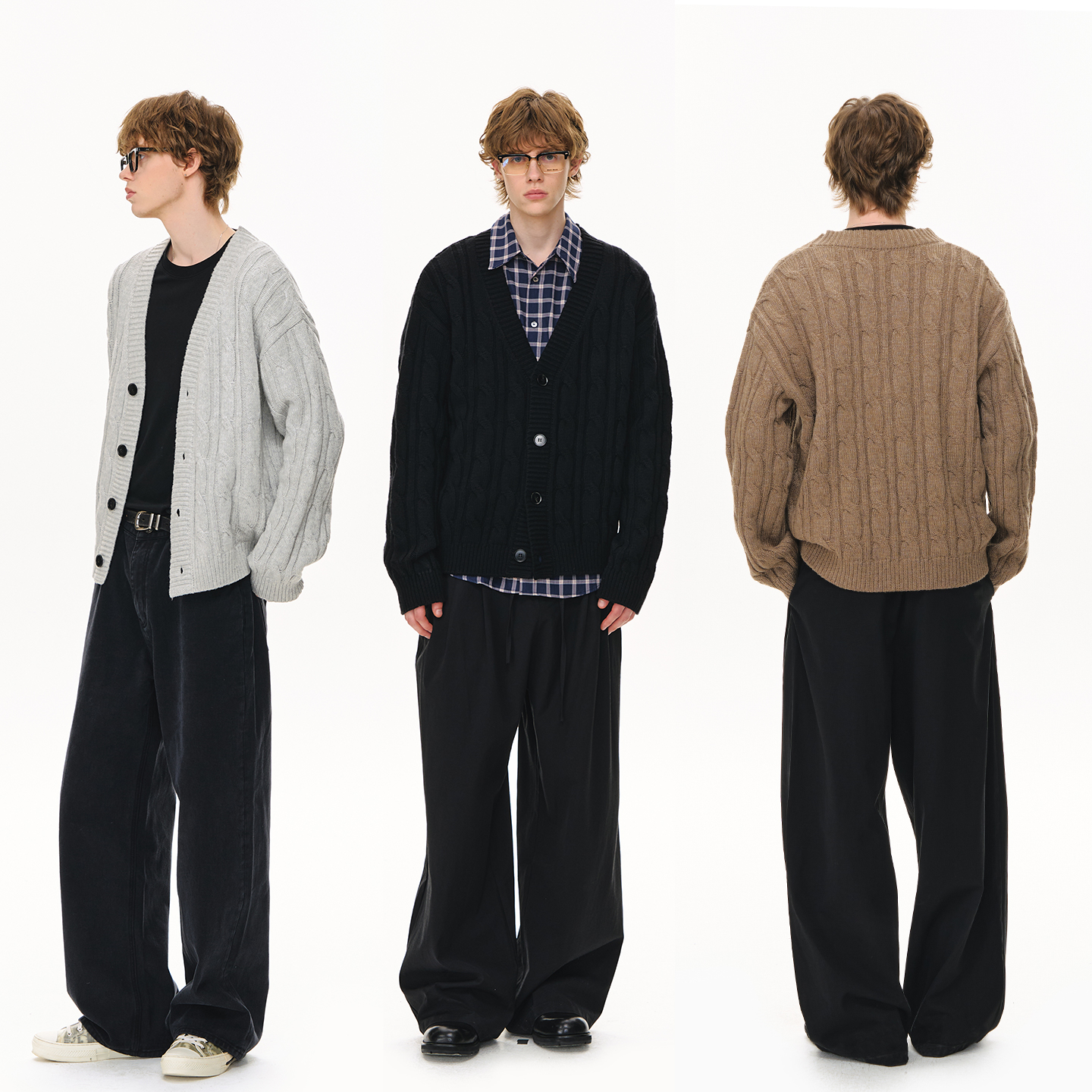毛衣男女款 CLIMAX VISION慵懒松弛羊毛混纺复古绞花V领针织开衫